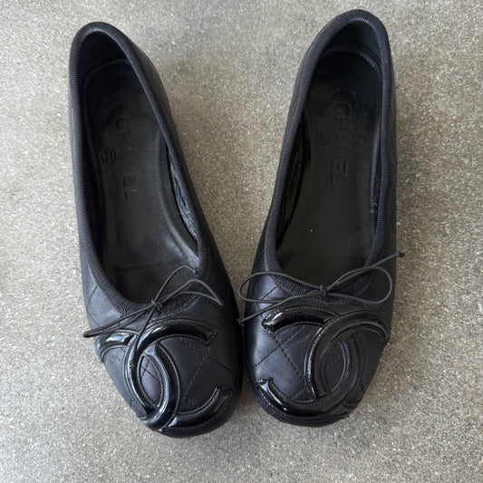 Black Lambskin and Patent Leather Chanel Cambon Ballet Flats - US 7