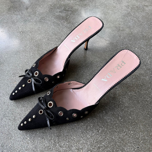 S/S2002 Prada Black Suede Grommet Mules - US 8