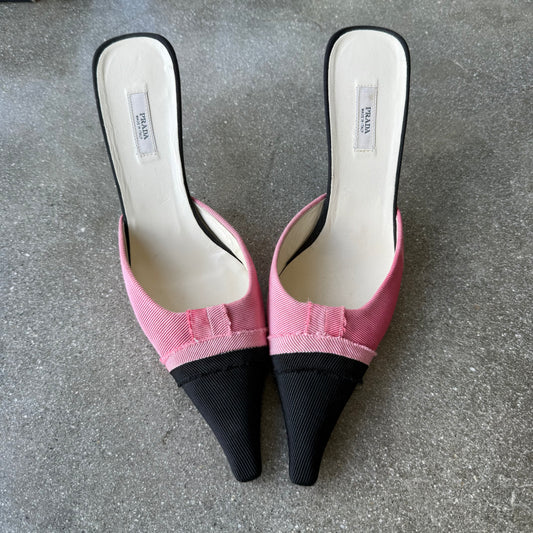 00s Prada Silk Black and White Grosgrain Mules - US 7