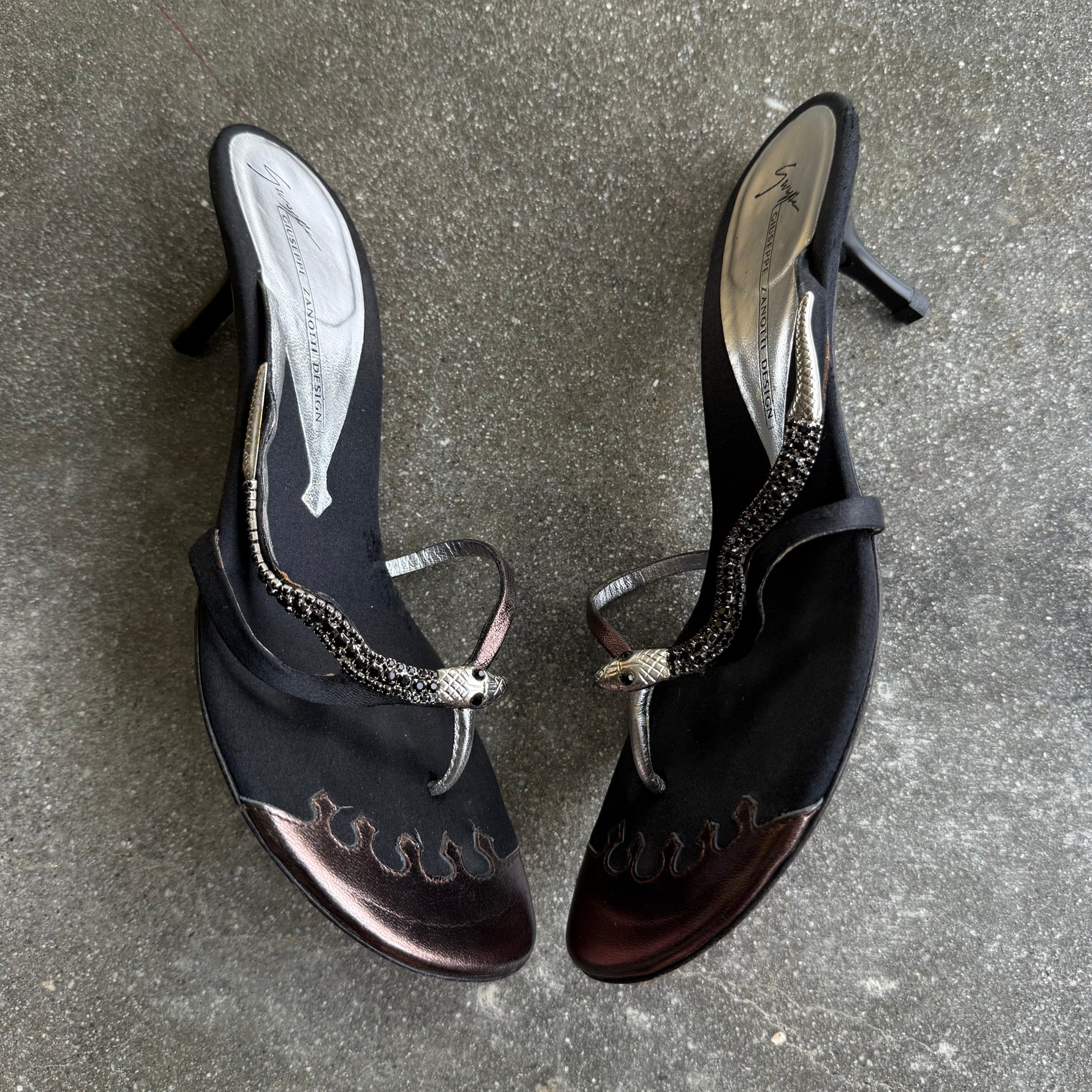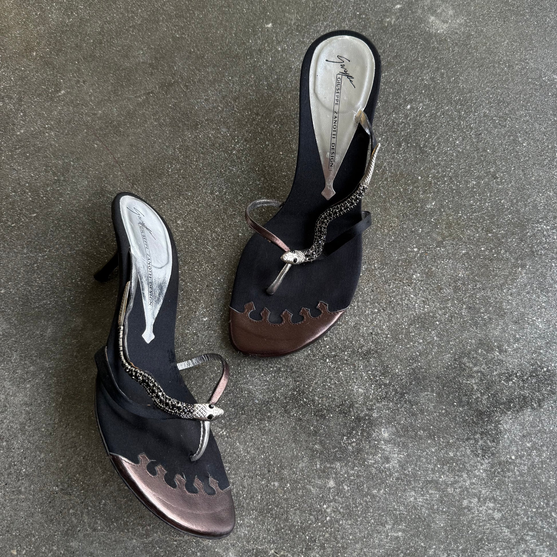 Vintage 00s Giuseppe Zanotti black satin snake sandals. Size 37, fits US 6.5 best. 3” heel. Snake rhinestone detail. Bronze leather detailing at toe. Comes with original box and dustbag. Brand new heel tips. Excellent vintage condition