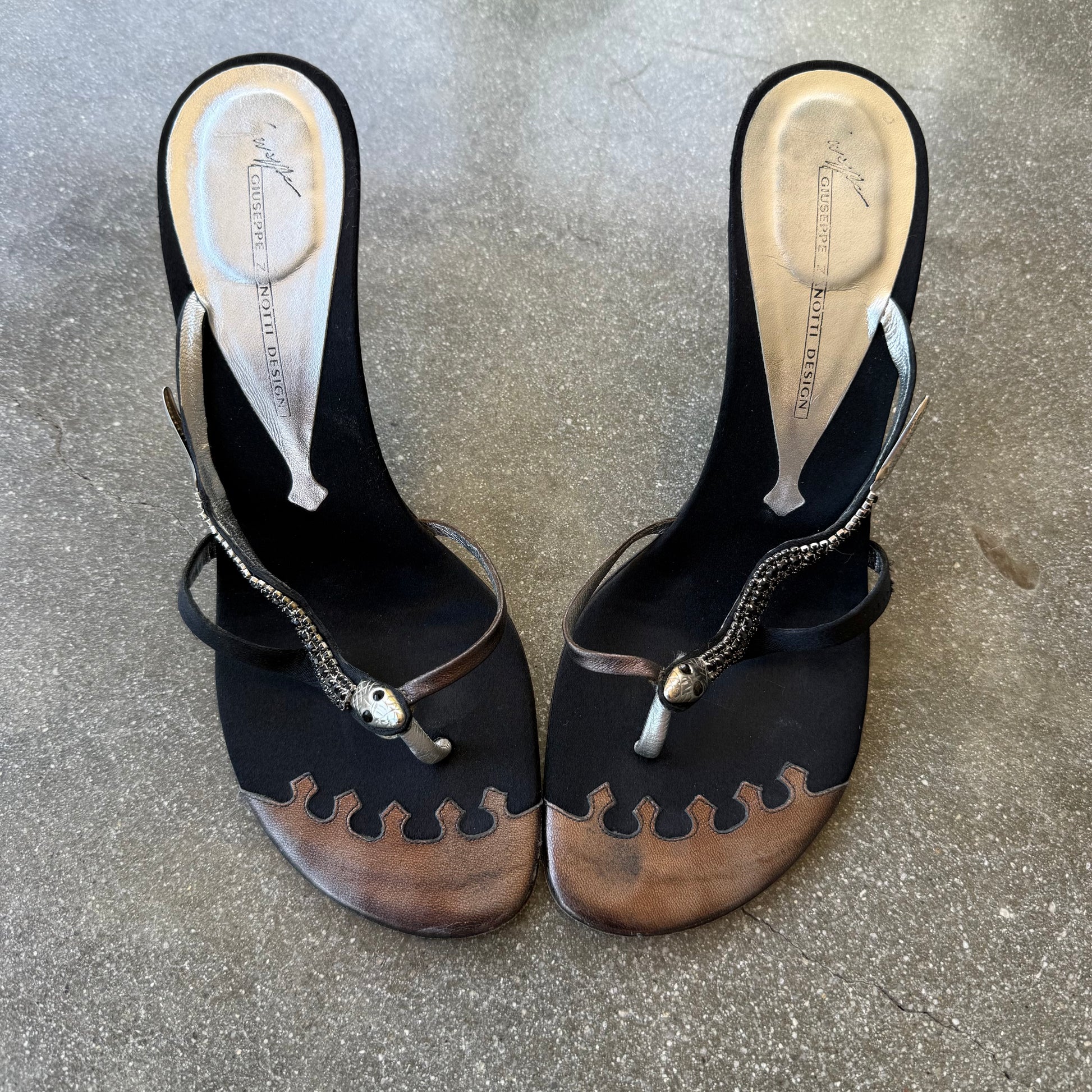 Rare Early 00s Giuseppe Zanotti crystal rattlesnake heeled flip flop sandals. Labeled 38, run small and fit US 7-7.5 best. 3.5” heel. Snake detailing with black rhinestones and satin straps. Bronze leather patchwork detailing at toe box. Light wear throughout. Brand new heel tips. No major flaws to note.