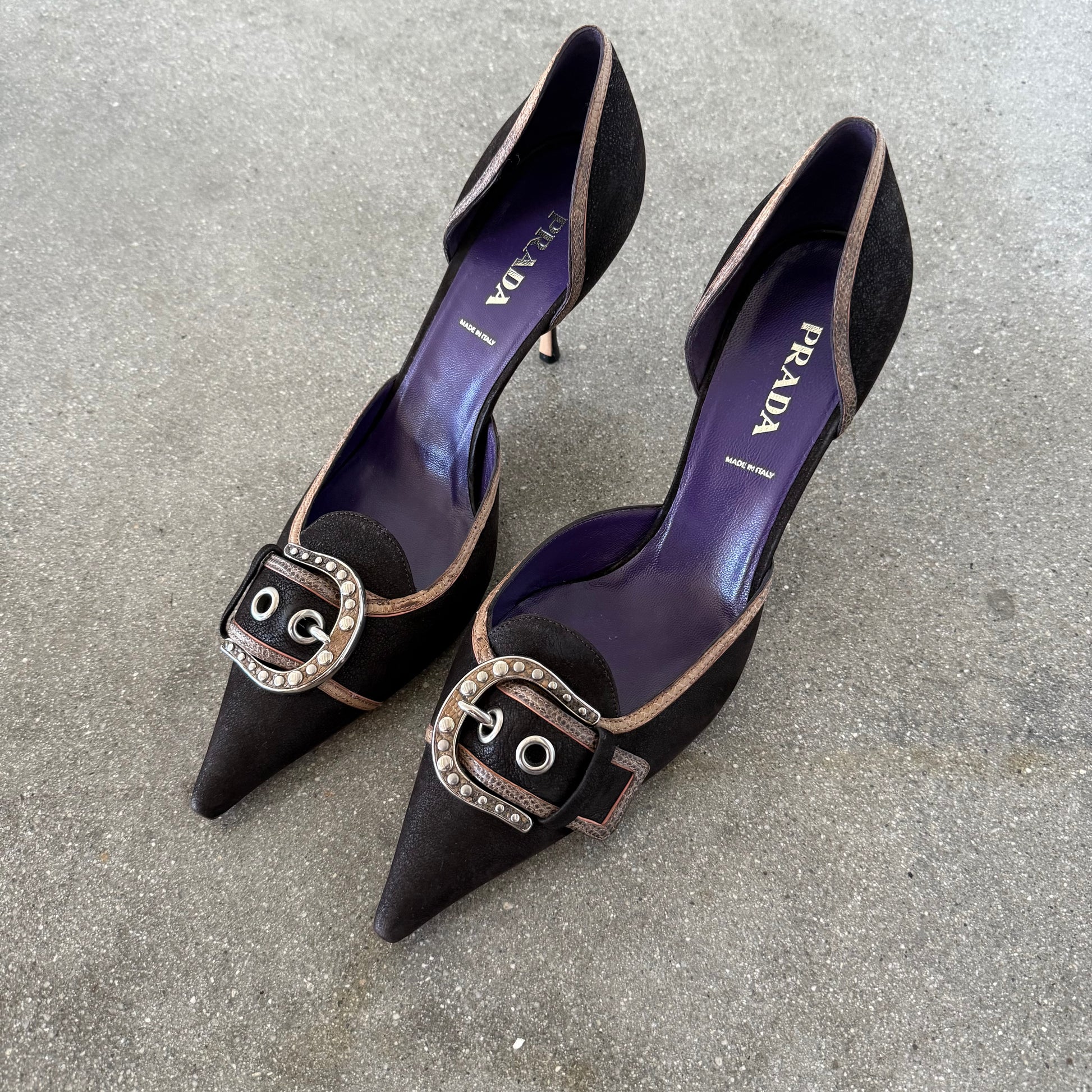 2003 Prada chocolate leather heels with buckles and pink python-embossed contrast trim. Brand new, unworn with original dustbag. Labeled size 41, runs large and fits US 12 best. 3.5” heel. Super rare to find in this condition. Comes with original dustbags.