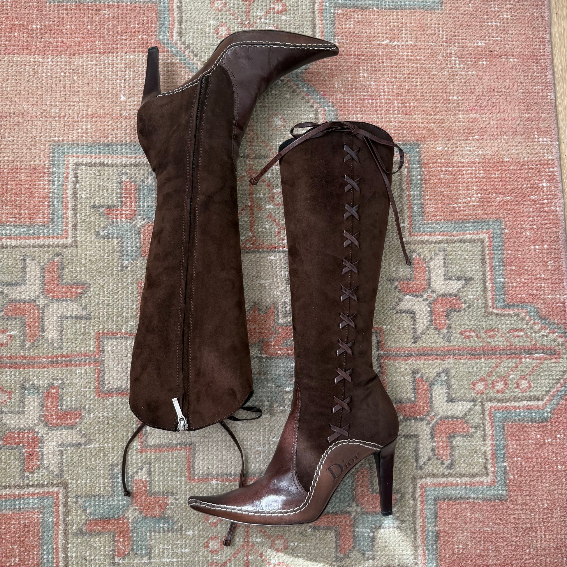 Ultra rare FW2001 John Galliano Christian Dior western suede chocolate brown lace up boots. Labeled size 37, fits US size 7 best. Lace up detailing. Instep zipper. Taupe topstitching throughout. Wooden heel. Excellent vintage condition. Shaft measures 14”; calf circumference measures 14”. Brand new heel tips.