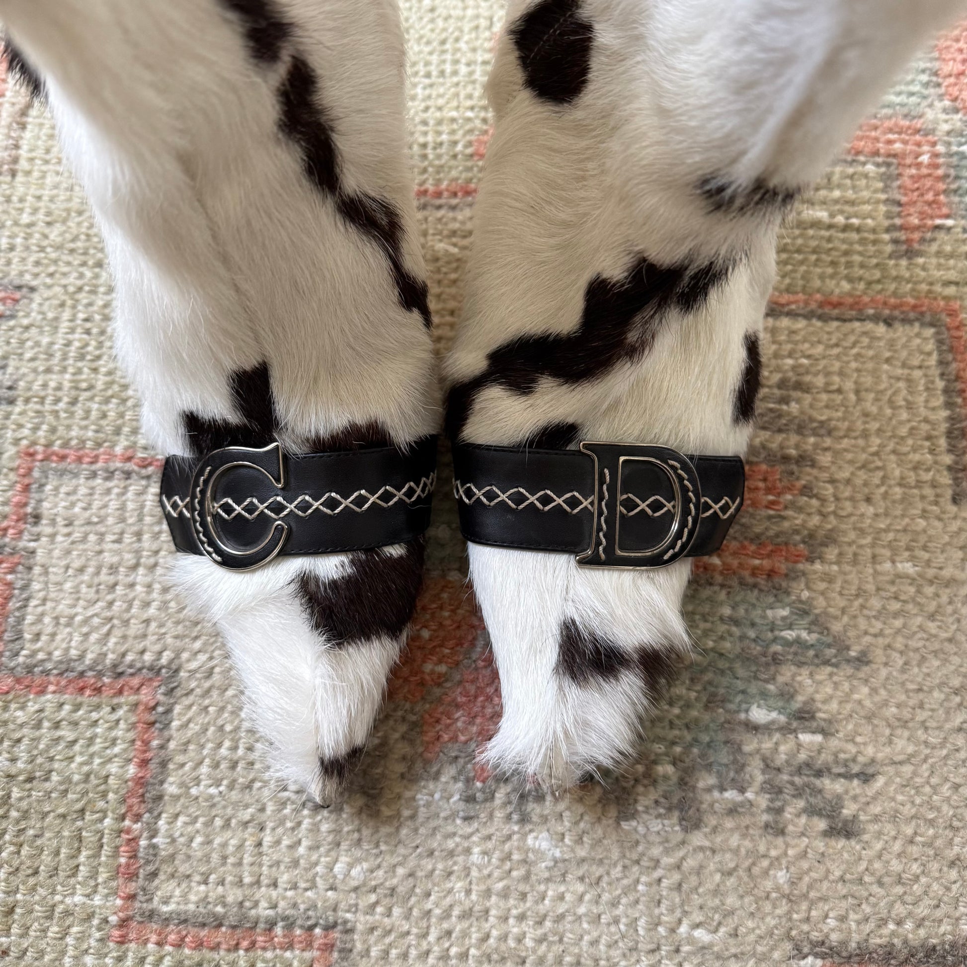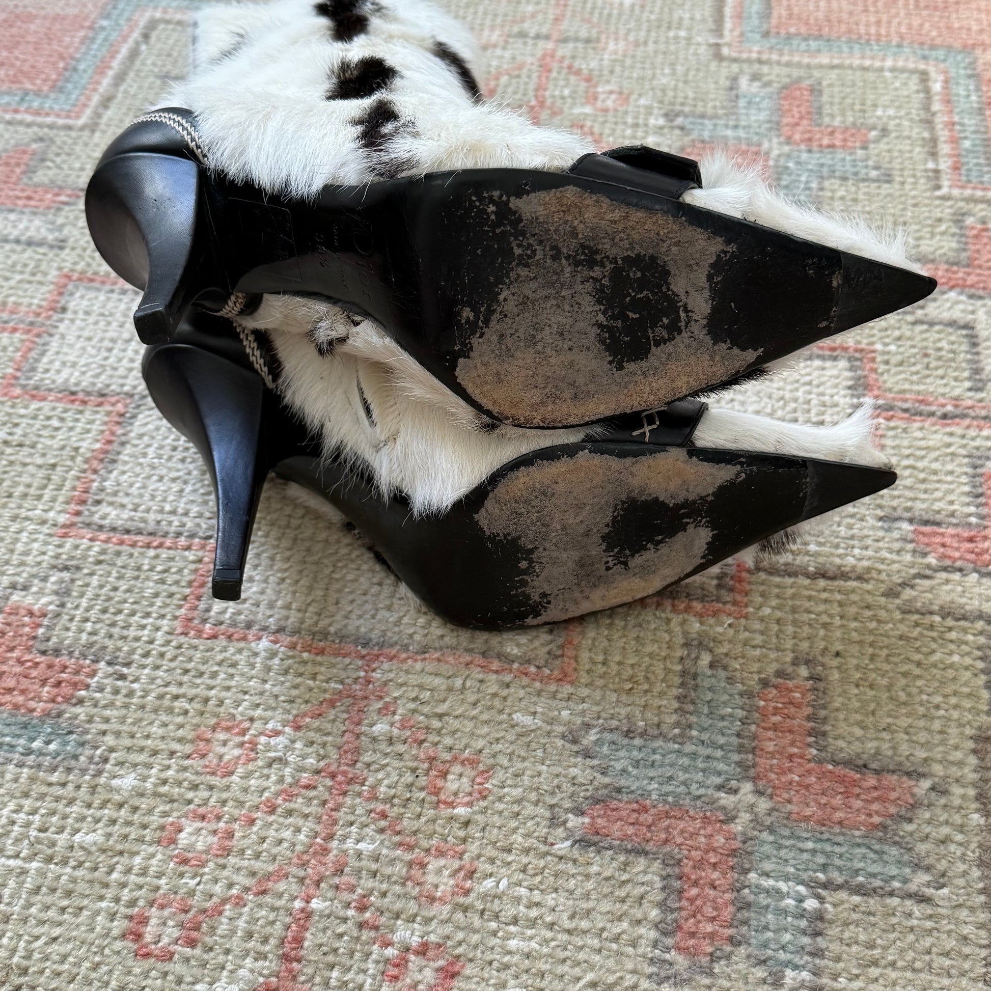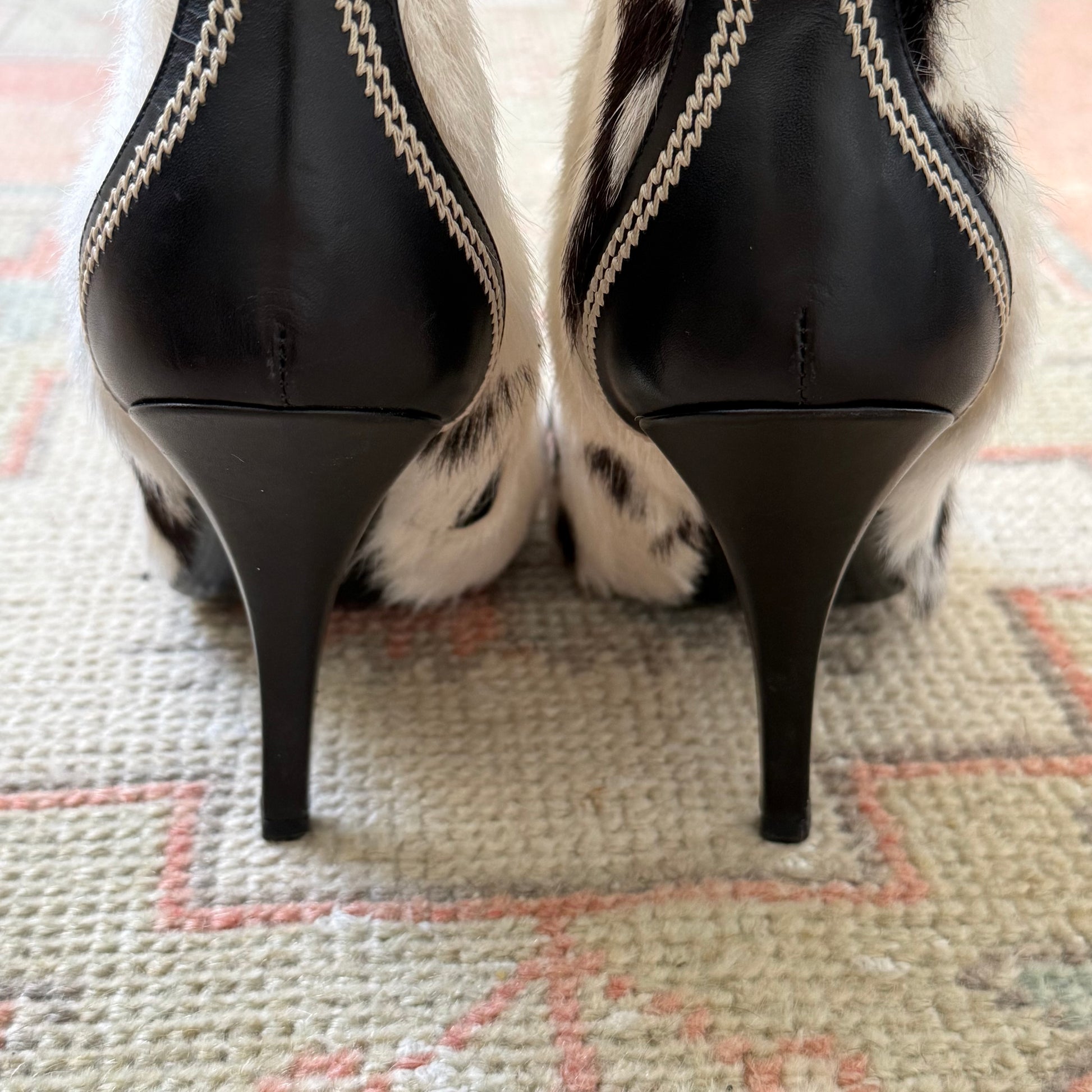 Ultra rare F/W2005 John Galliano Christian Dior cow hair ankle boots. Labeled size 39.5, run small and fit US 8.5 best. “C” and “D” leather logos at toes. Black leather contrast trim with white zigzag stitching. 4” heel. Nickel instep zipper. 6” shaft 12.5” calf circumference. Excellent vintage condition. Brand new heel tips. Comes with original box and dust bags.