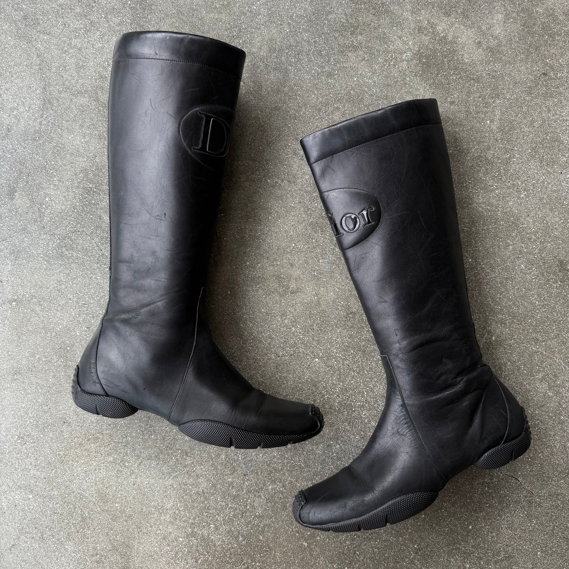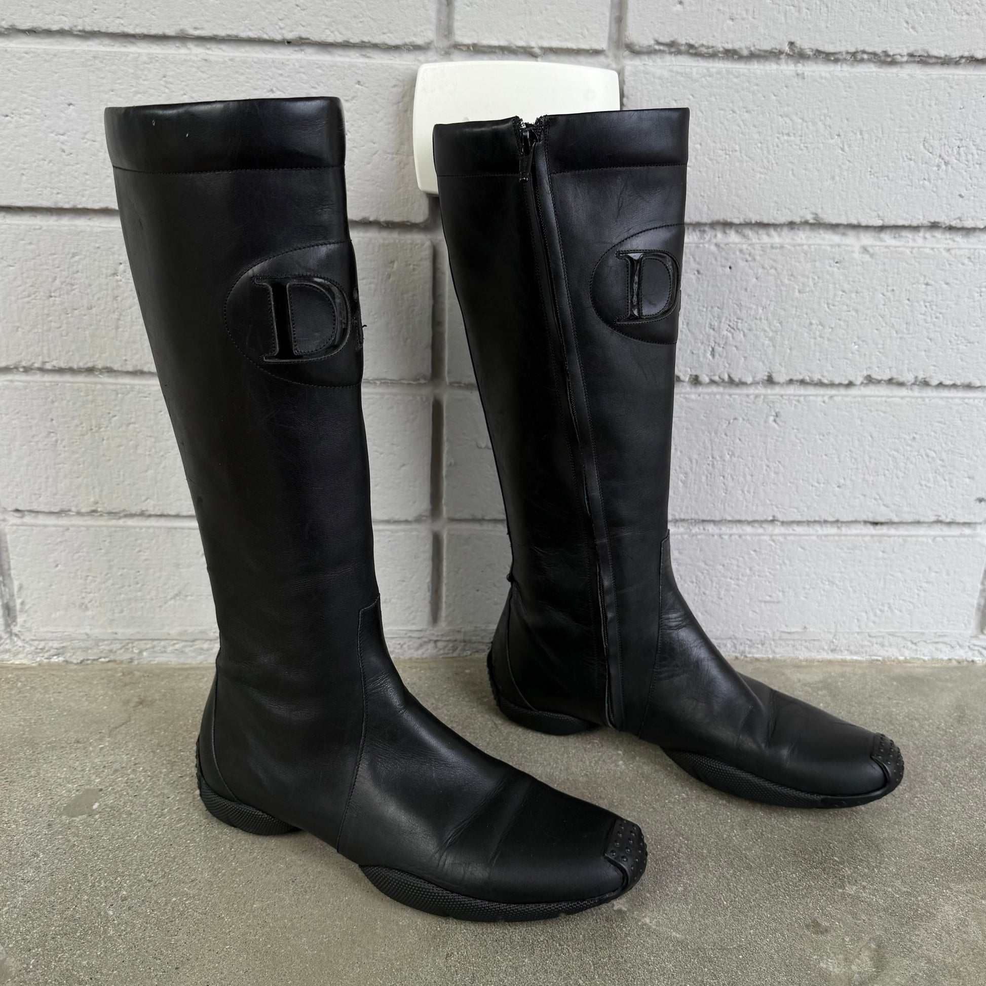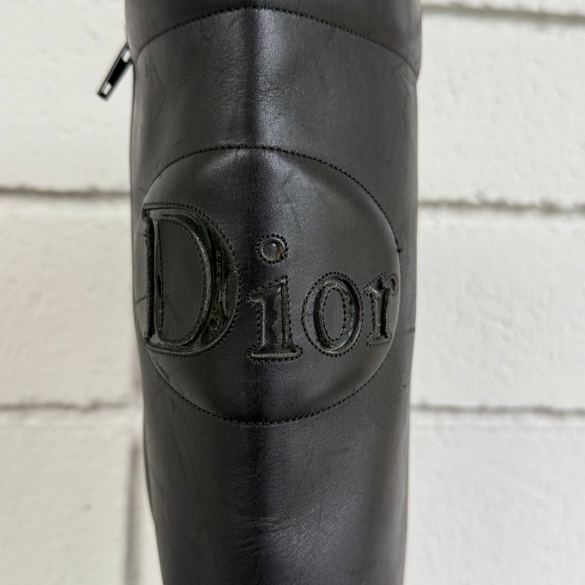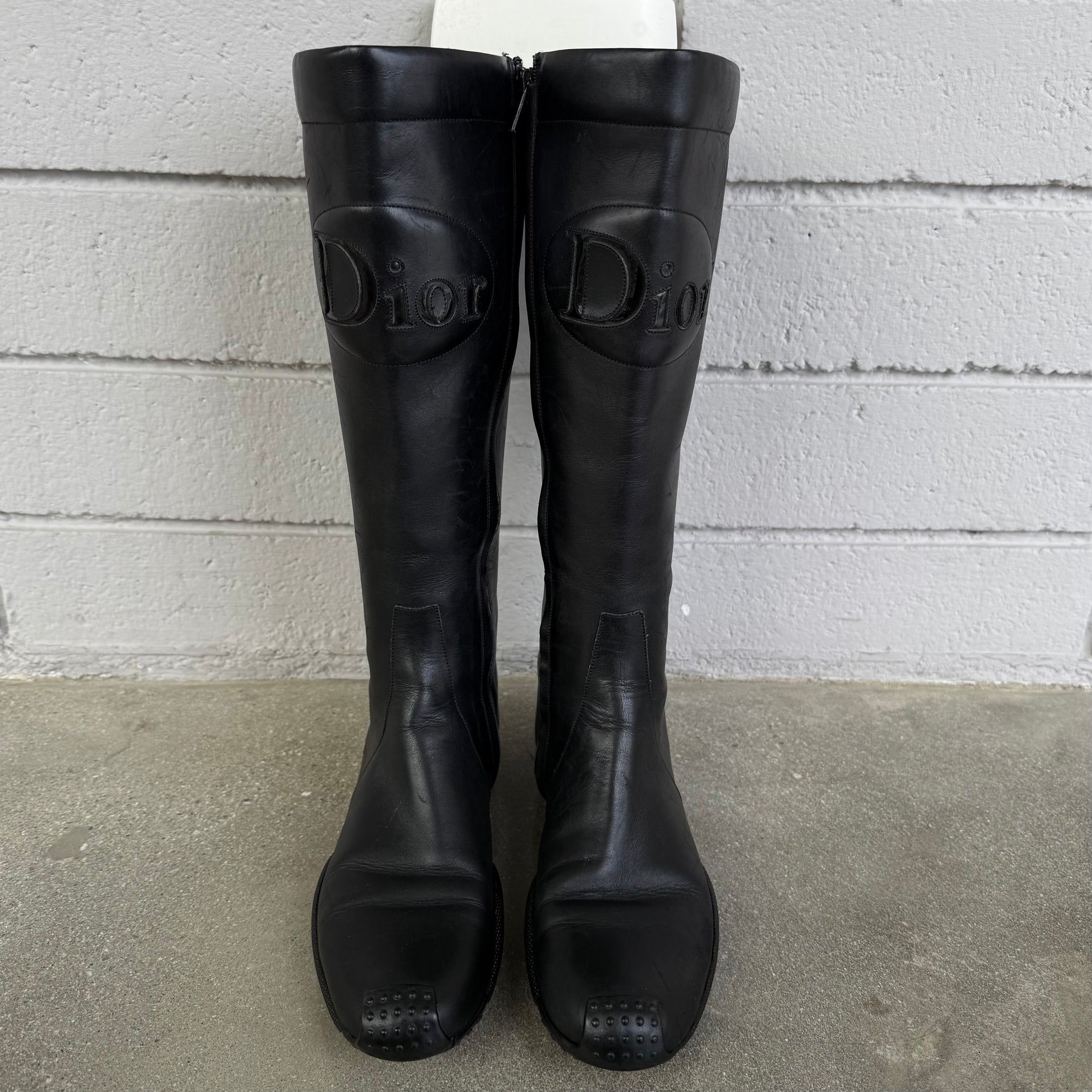 John Galliano Christian Dior FW01 black leather moto boots. Labeled size 37.5, fits US 7 best. 12” shaft, 13” calf opening. Instep zipper opening. Dior logo in contrasting patent leather. Very good vintage condition, no major notable flaws.