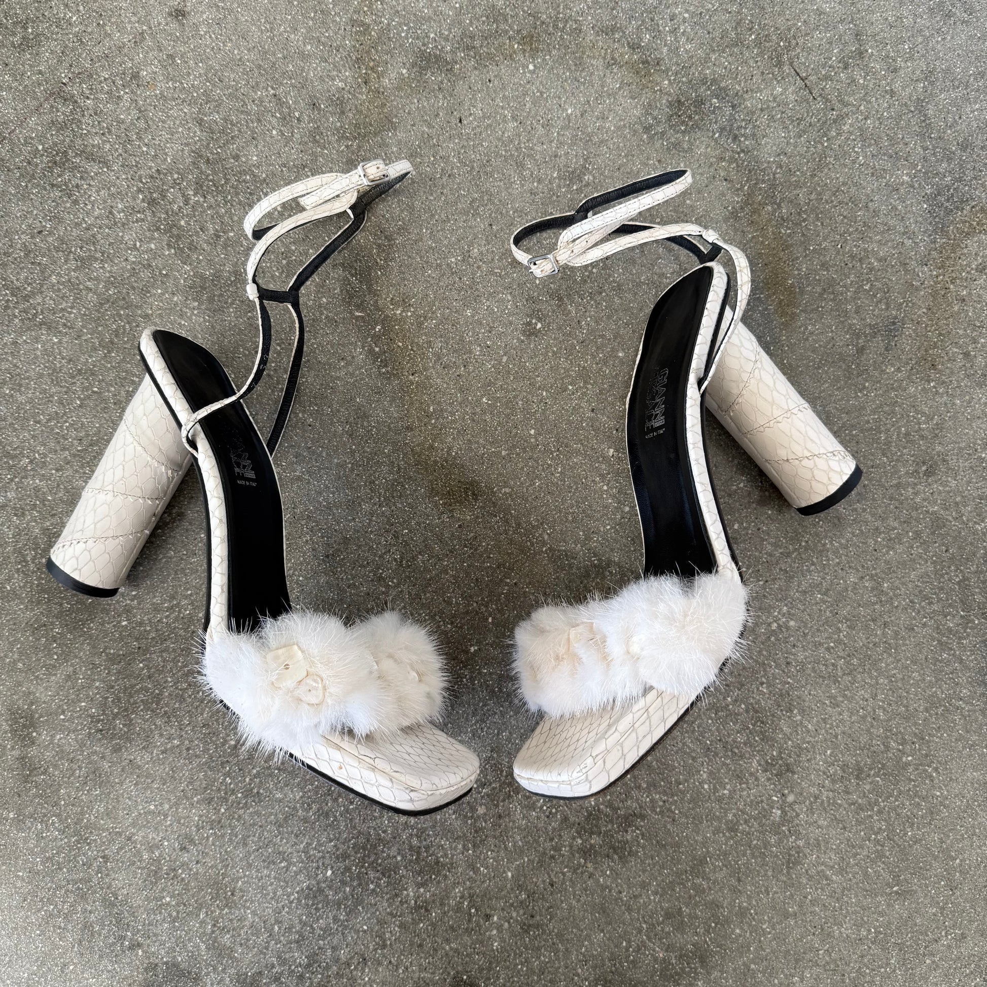 Ultra rare FW99 Gianni Versace white python and mink fur strappy sandals. Labeled 39, fits US 8-8.5 best. Adjustable wraparound ankle strap. 5.5” conic heel. Mother of pearl buttons at toe box. Brand new heel caps. Light wear throughout, very good condition. No notable flaws.