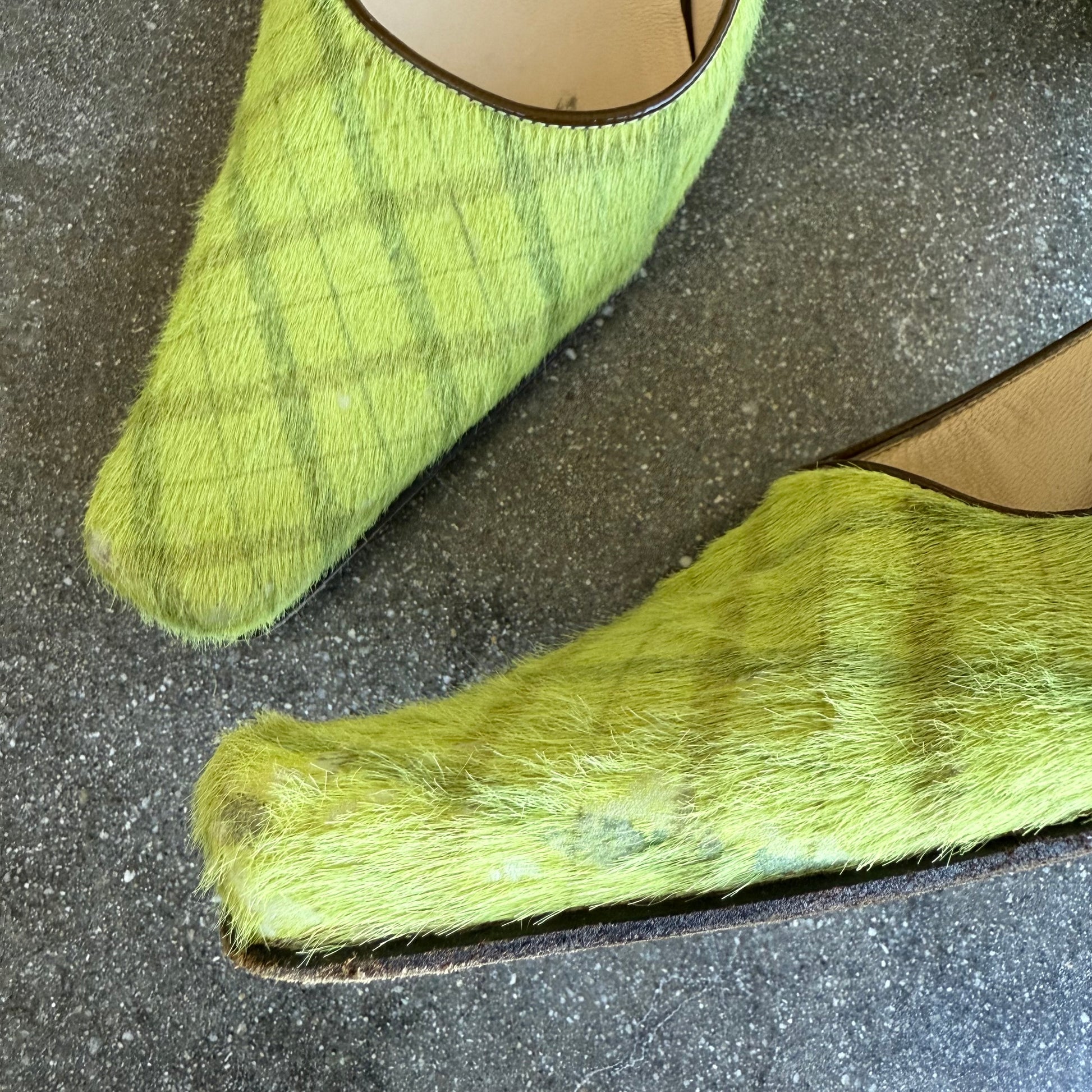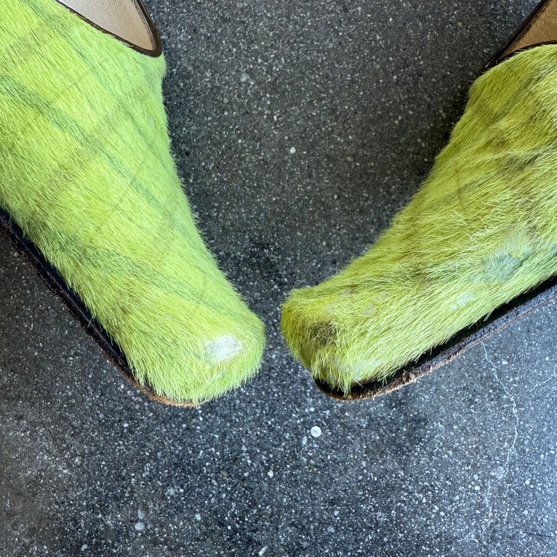 Super rare miu miu fw99 ponyhair chartreuse/lime green tartan Mary Janes. Labeled 39.5, these run LARGE and fit US 10-narrow 10.5. 4” sculptural conic heel. Square toe. Dark olive patent leather contrast trim. Velcro strap at ankle. Good vintage condition, some balding at toe box, no other major flaws