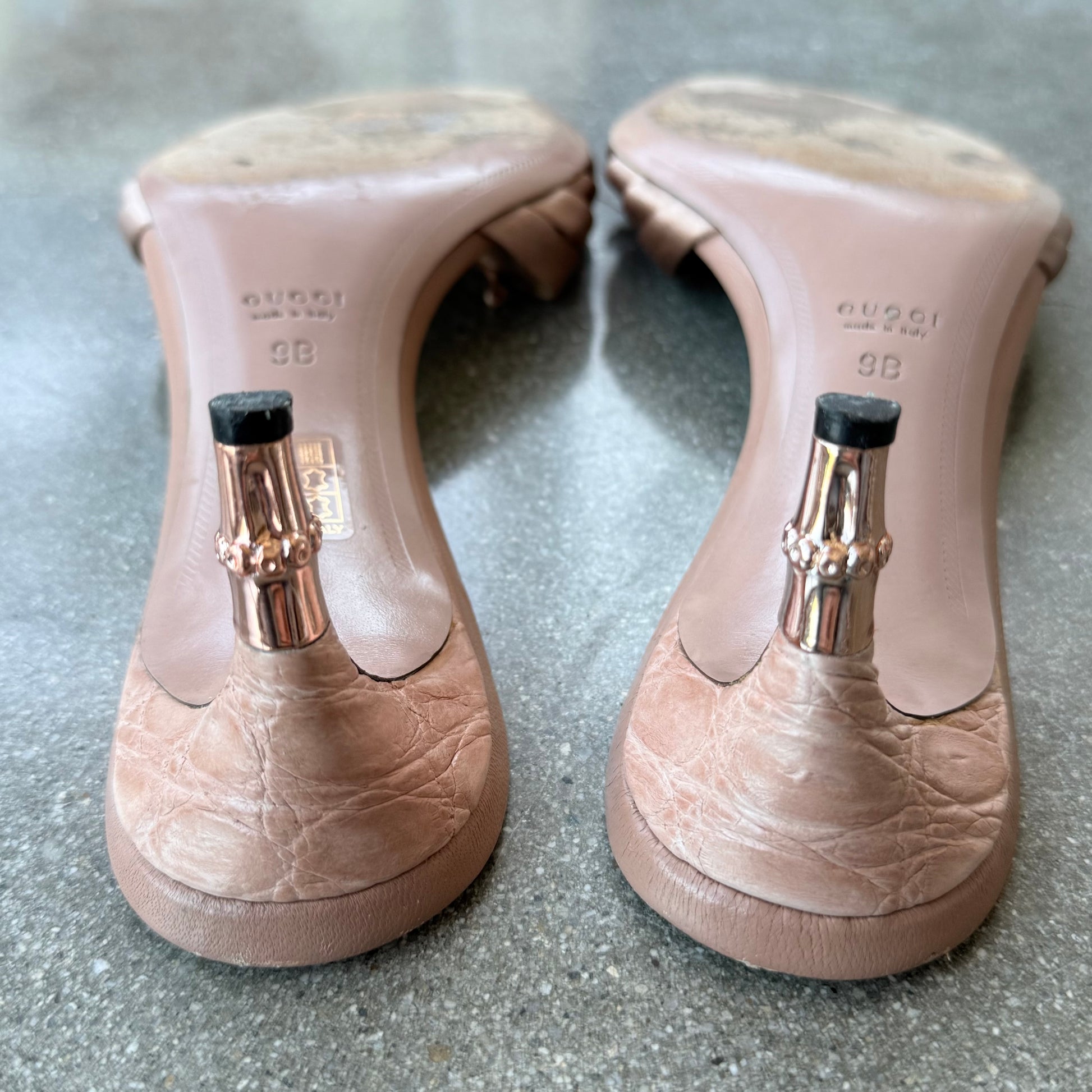 S/S2004 Tom Ford Gucci bamboo blush-colored silk satin mules. Labeled size 9, run large and fit US 9.5 best. Instep measures 10.5” edge to edge. Gold bamboo heel with croc-embossed leather heel. Adjustable bow. Light wear throughout, overall excellent vintage condition.