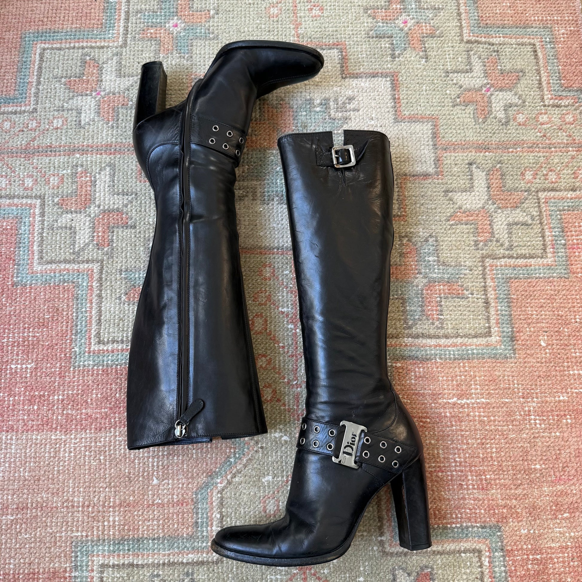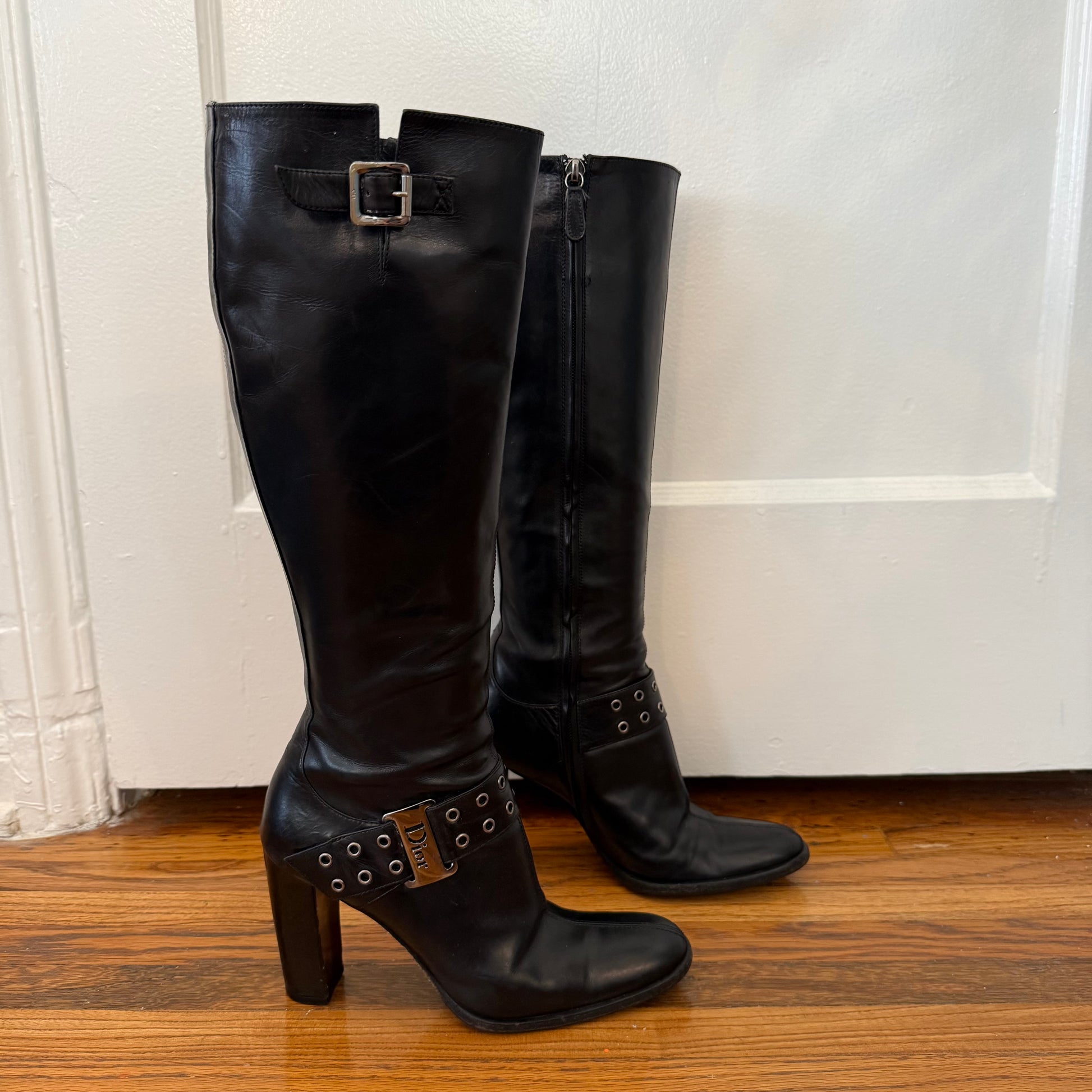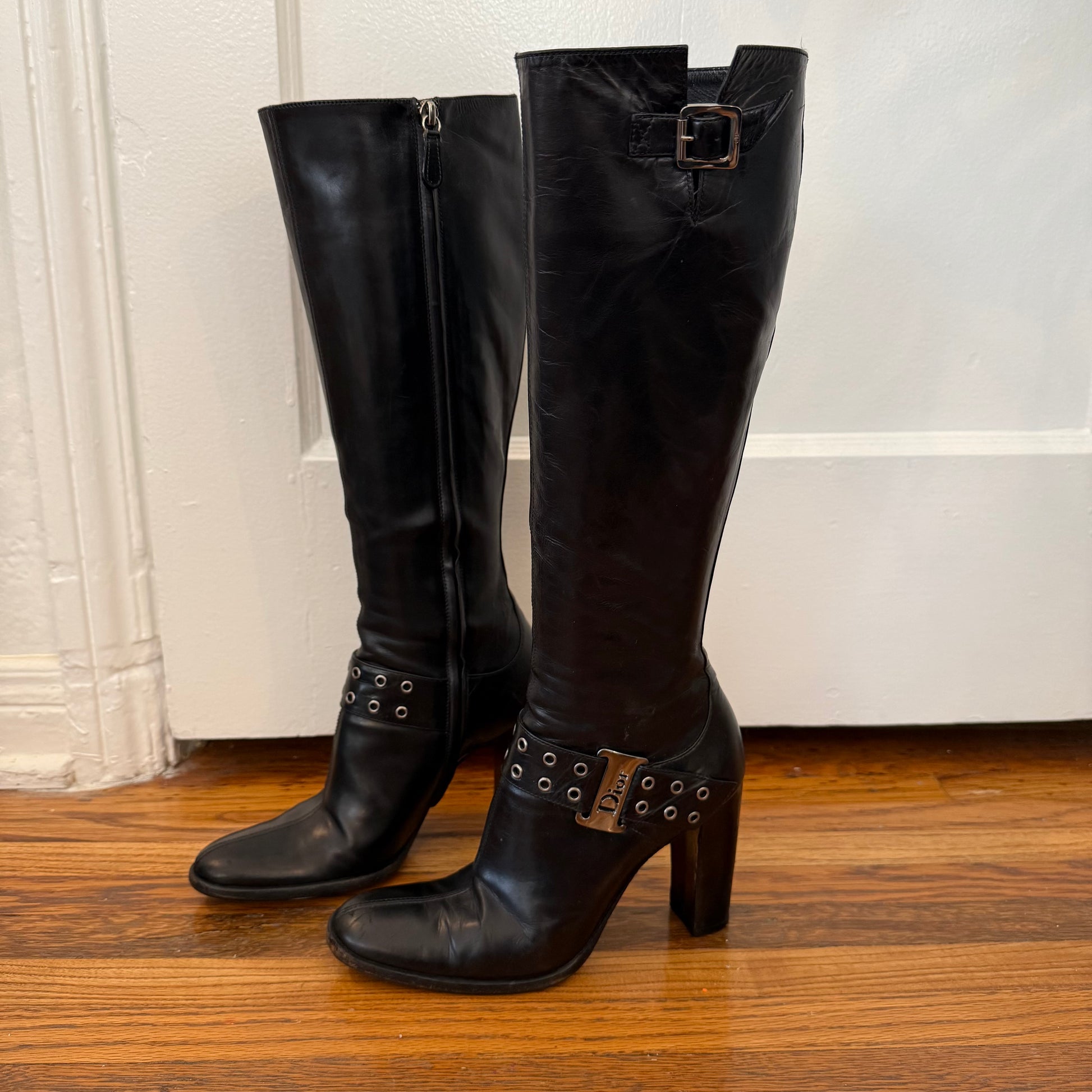 S/S2003 John Galliano Christian Dior black leather boots. Labeled size 35.5, runs large and fits US 6 best. Chrome colored hardware. Instep zipper. 4” heel; 12” shaft; 13” calf circumference. Very good vintage condition, light wear throughout. Vibram soles have been added + have light wear.