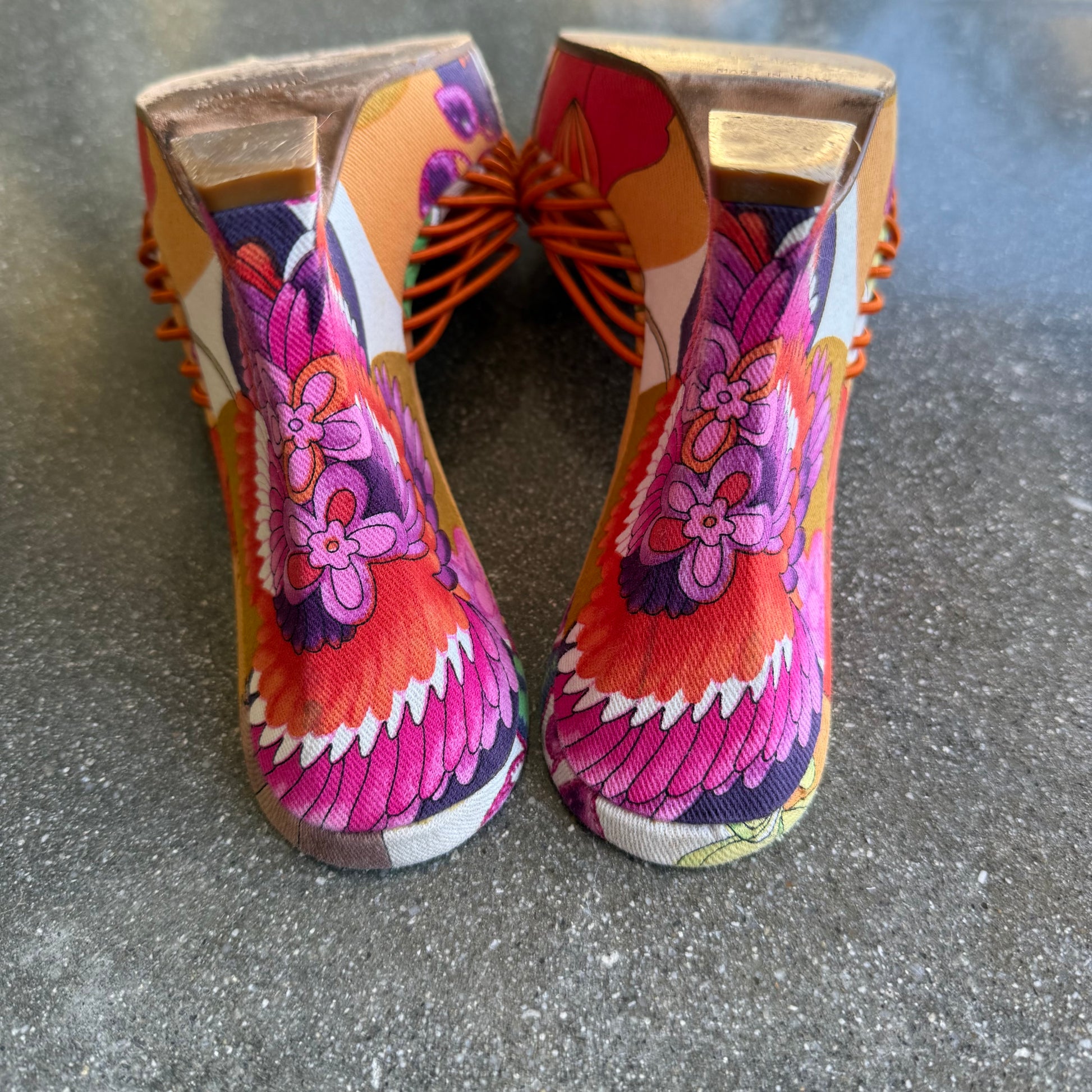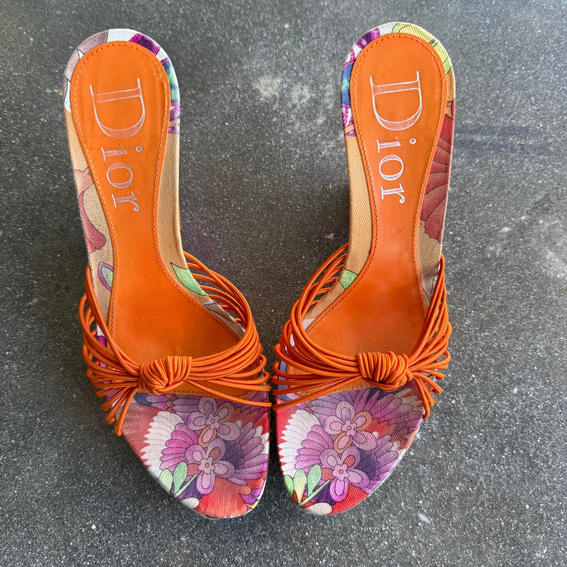 Super rare S/S2003 John Galliano for Christian Dior tropical print knotted wedges. Labeled size 38, fits US size 7.5 best. Orange, purple and pink floral and gemstone print. 5” sculptural heel. Excellent vintage condition, no major flaws to note.