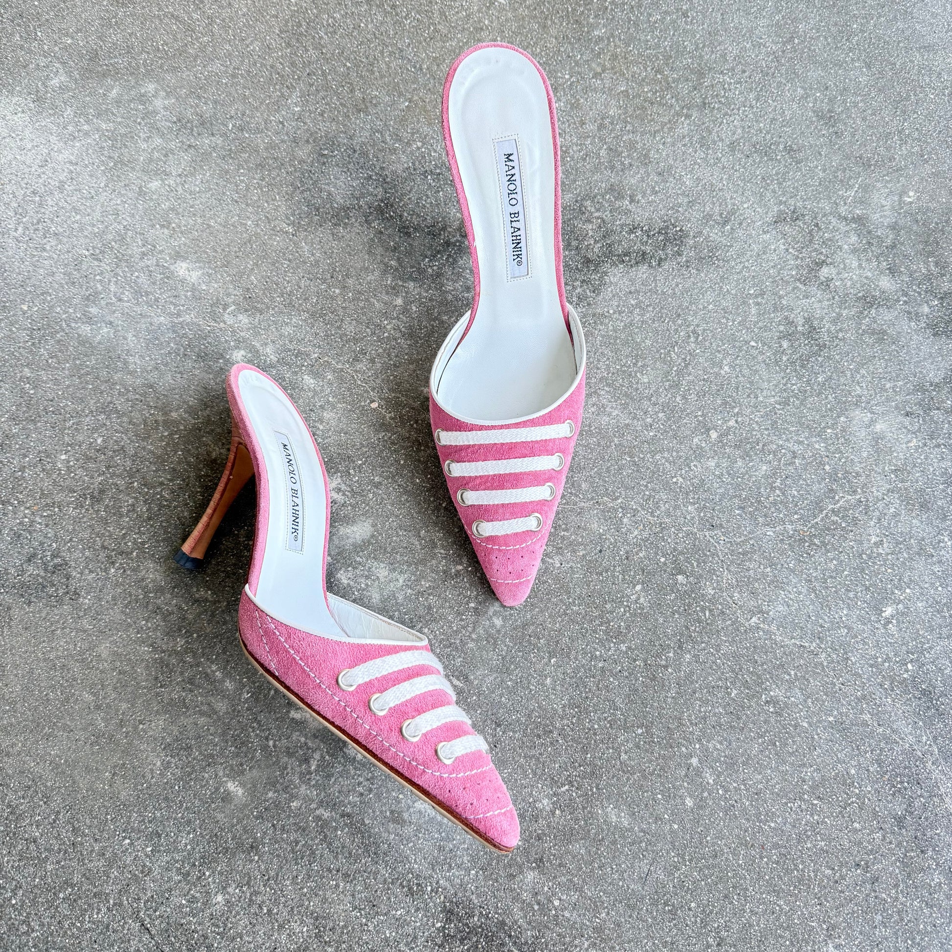 S/S2003 Pink Suede Manolo Blahnik Lace Up Mules - US 7.5