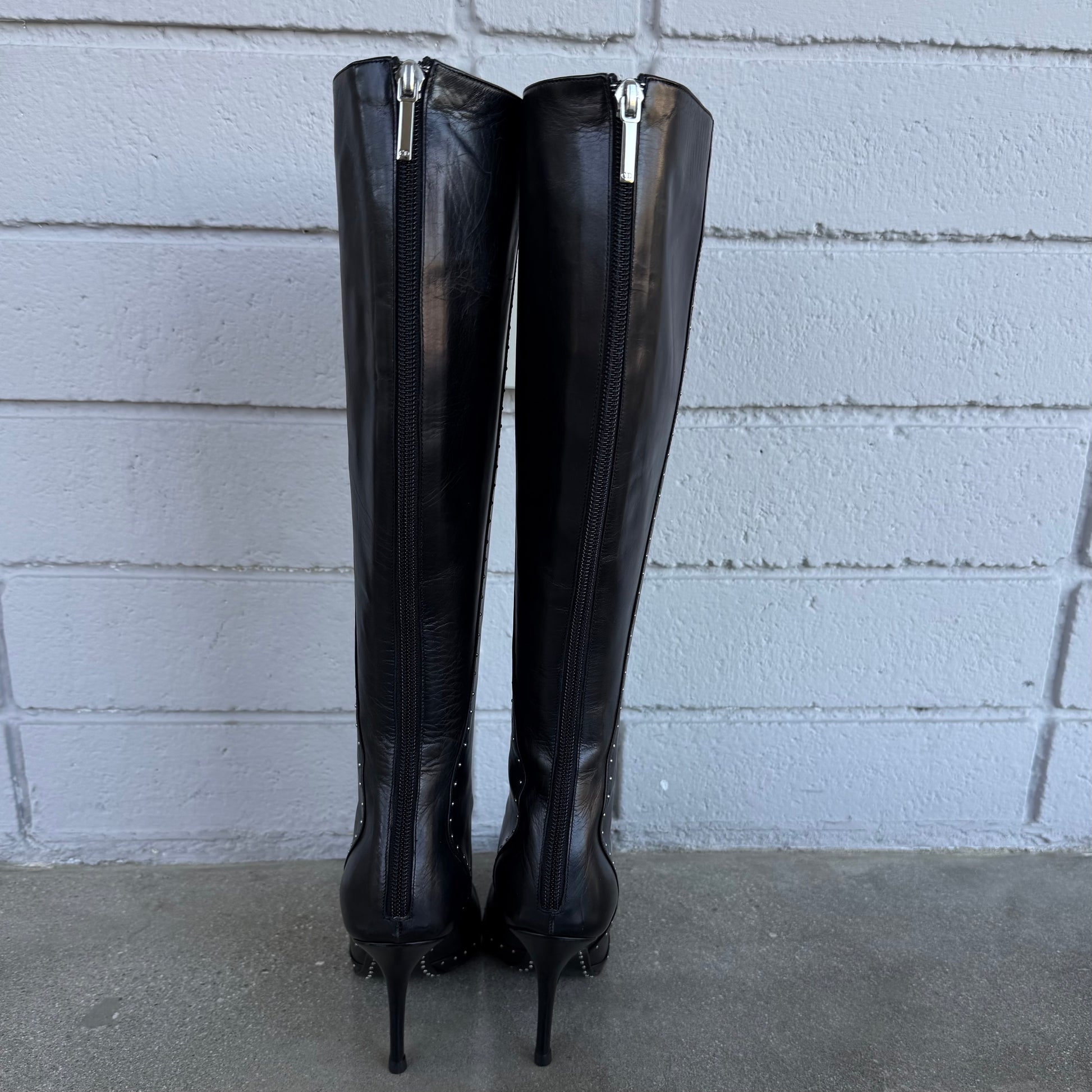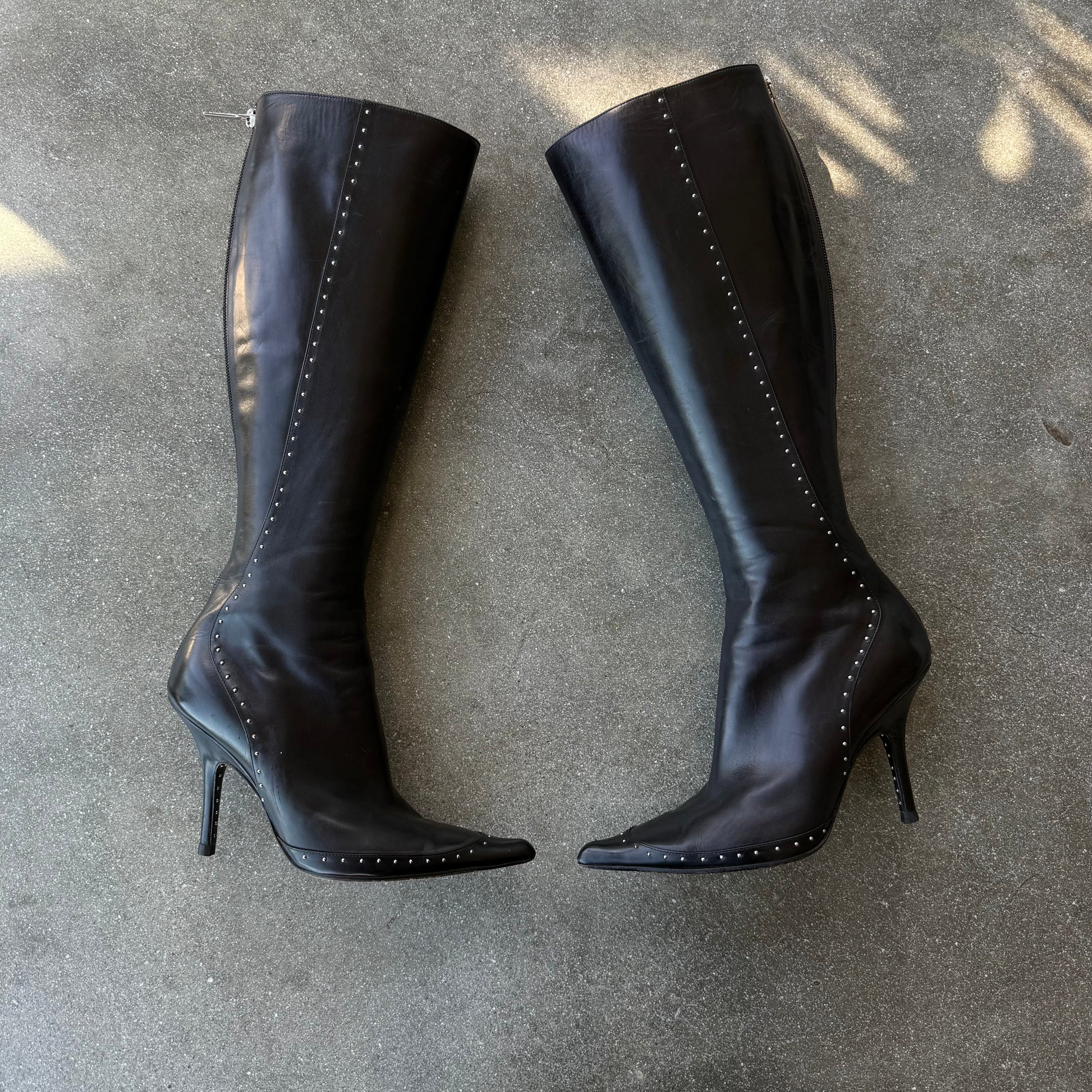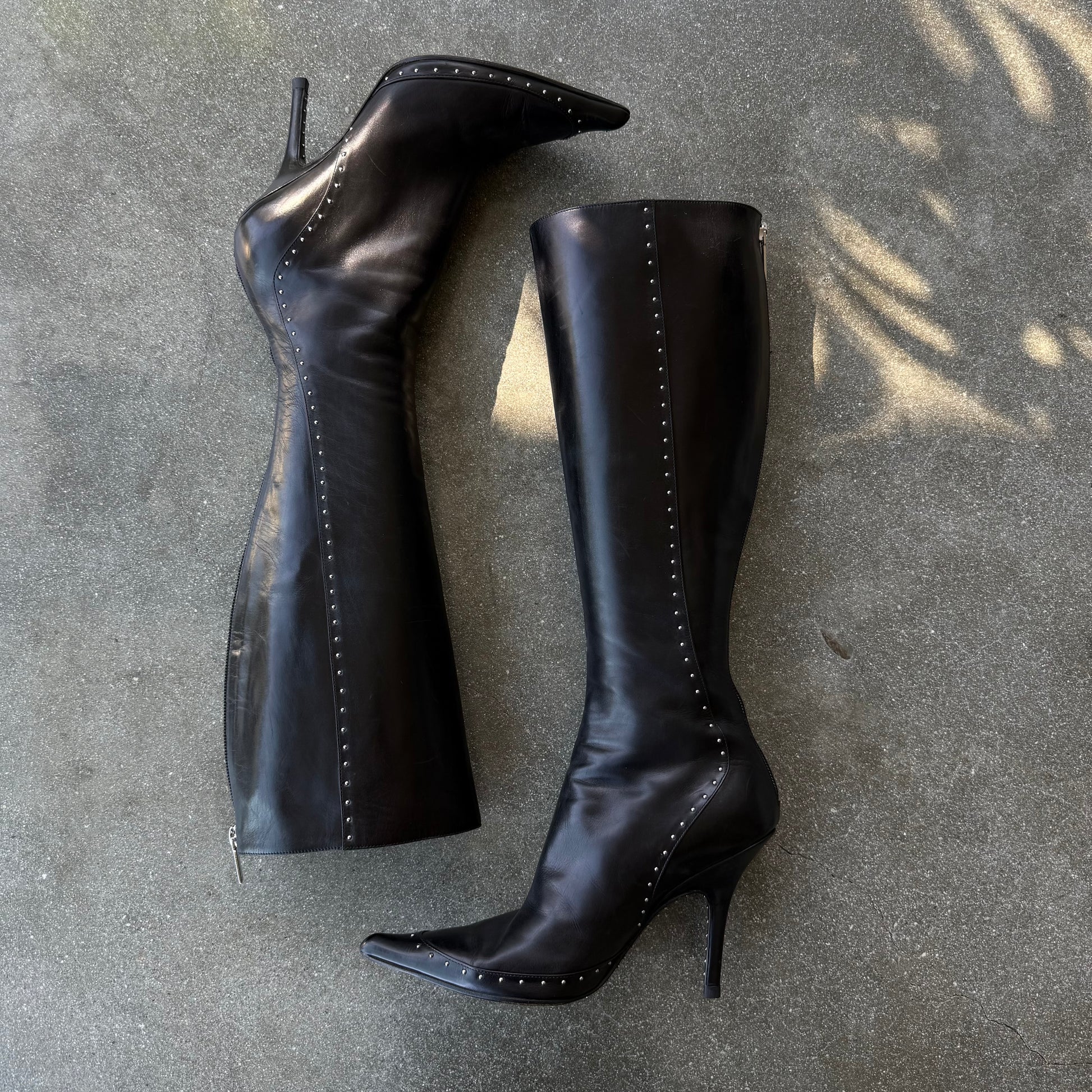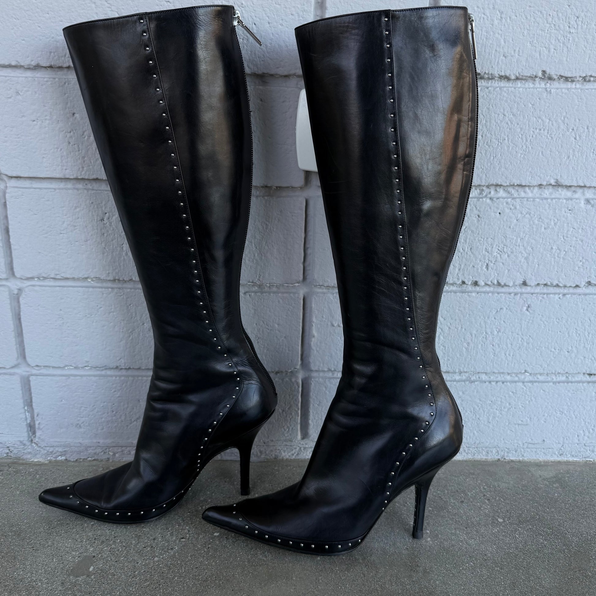 S/S2004 John Galliano Christian Dior black leather studded boots. Labeled size 37, fits US 7 best. Pointed toe. Center back zipper. Silver studding throughout. Brand new heel tips. Light wear throughout, overall excellent condition. 4” heel, calf circumference measures 13”.