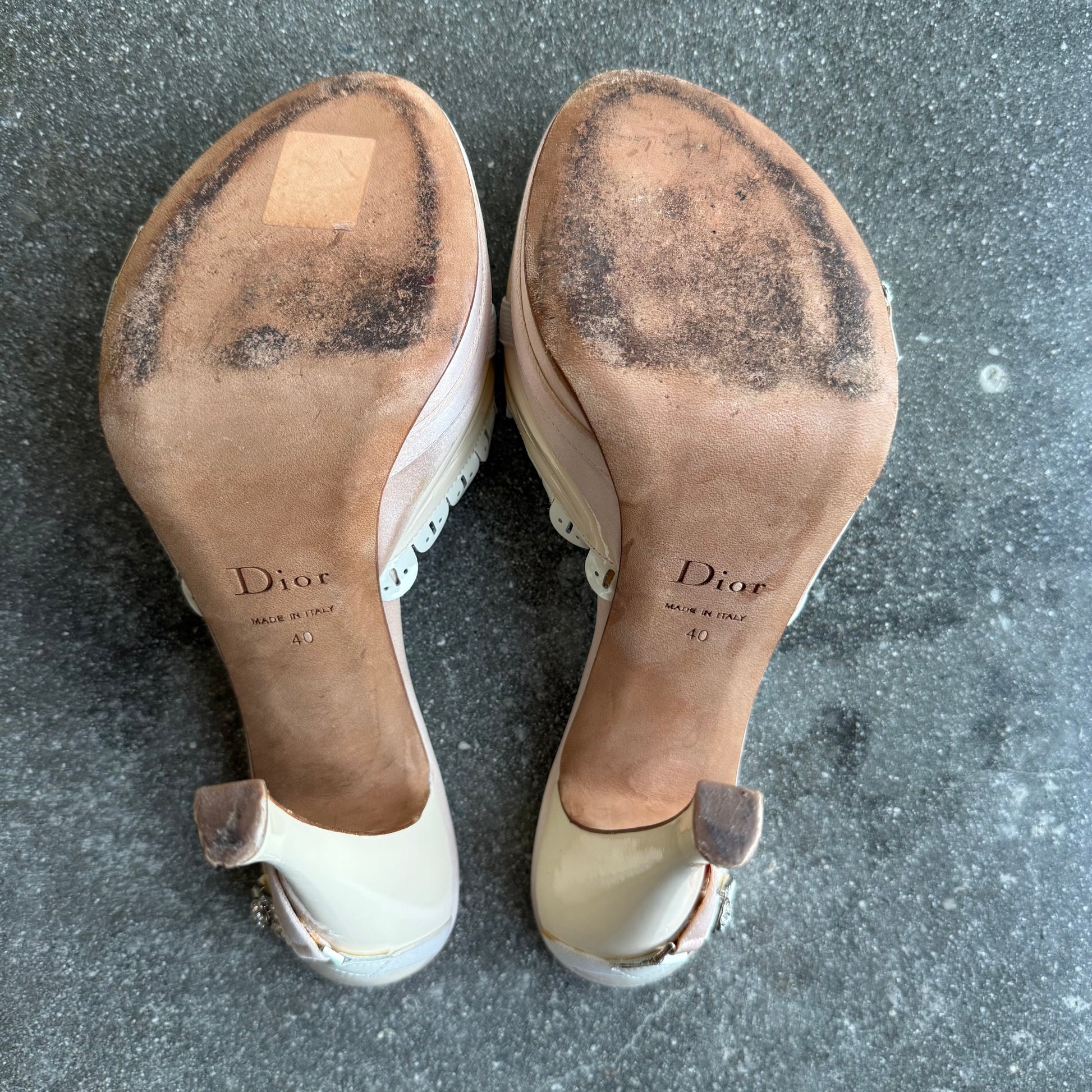 S/S2004 ultra rare John Galliano Christian Dior patent leather mules. Labeled size 40, fits US size 9.5 best. Instep measures 10.5” edge to edge. White and pink patent leather with scallop and rhinestone lingerie-style detailing throughout. 5” platform heel. Excellent vintage condition, no notable flaws.
