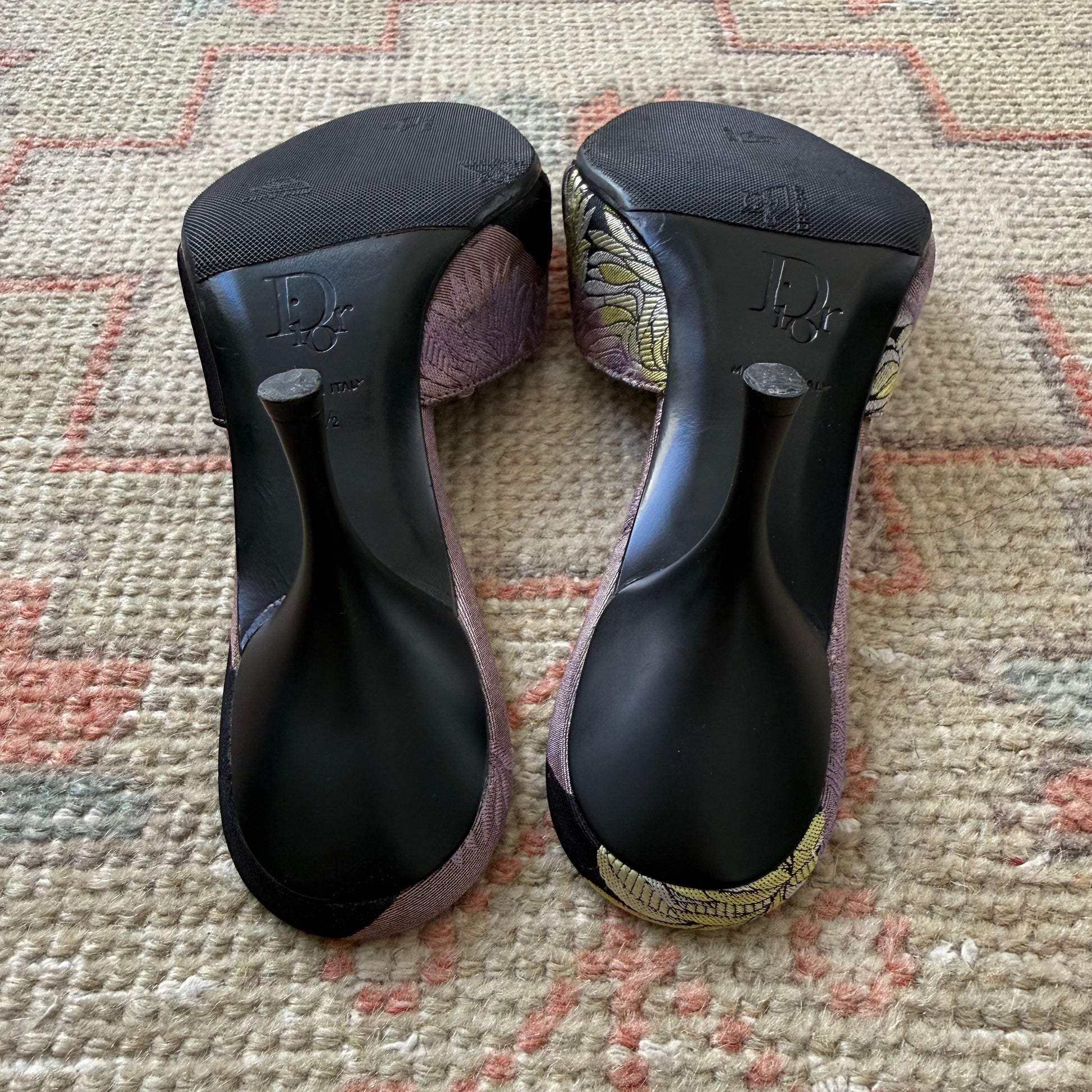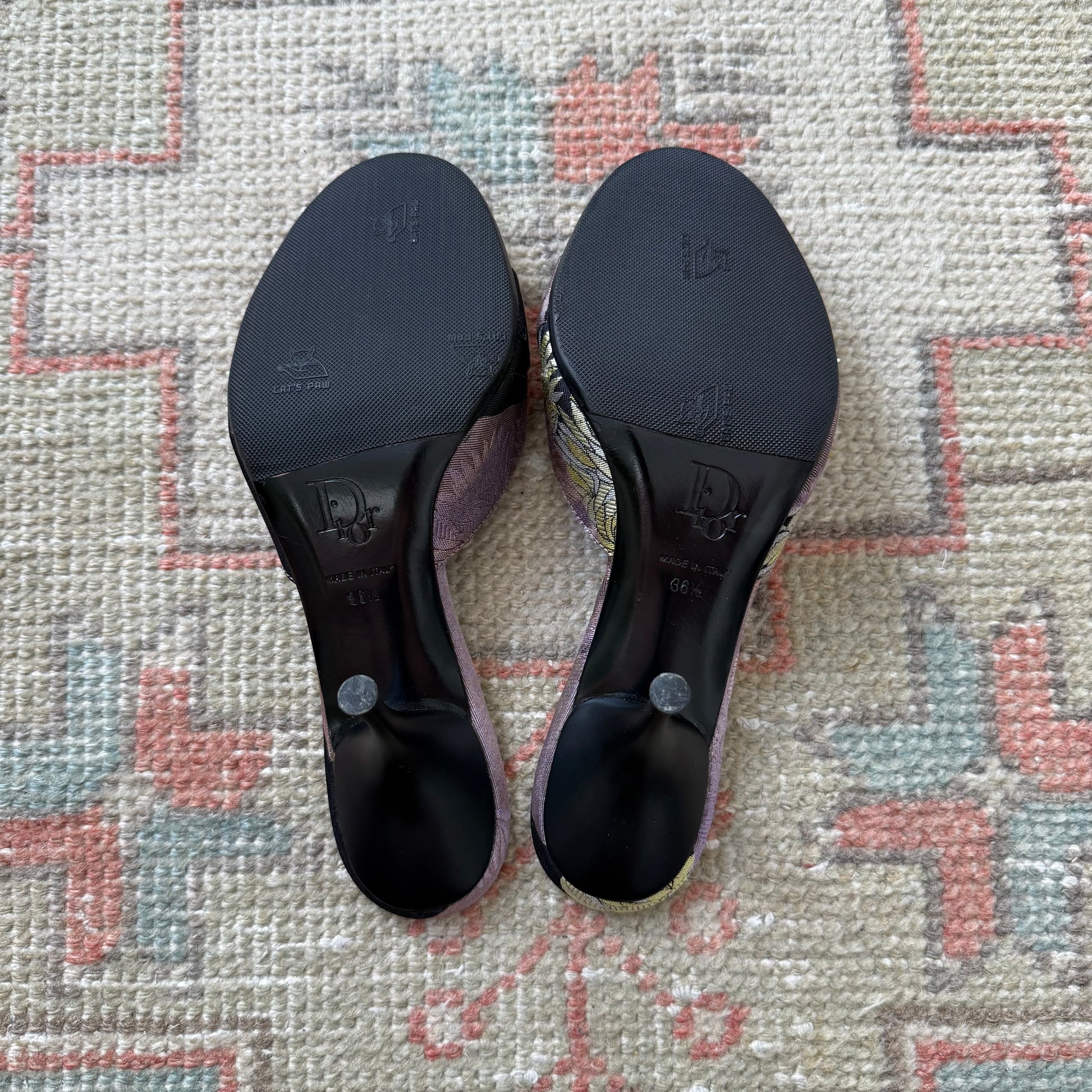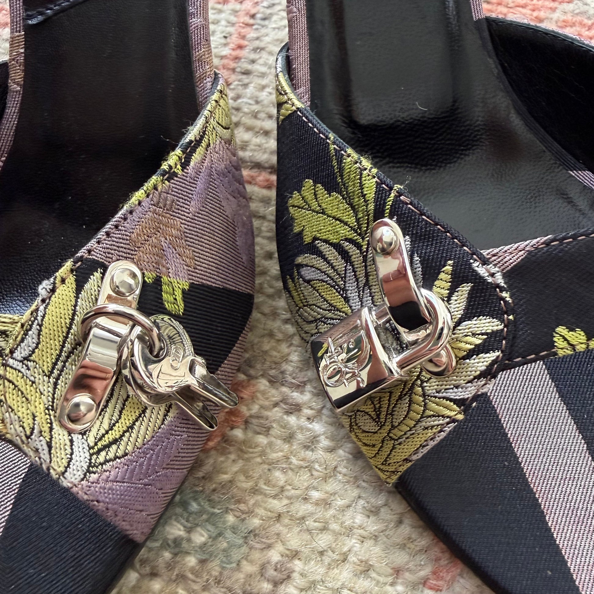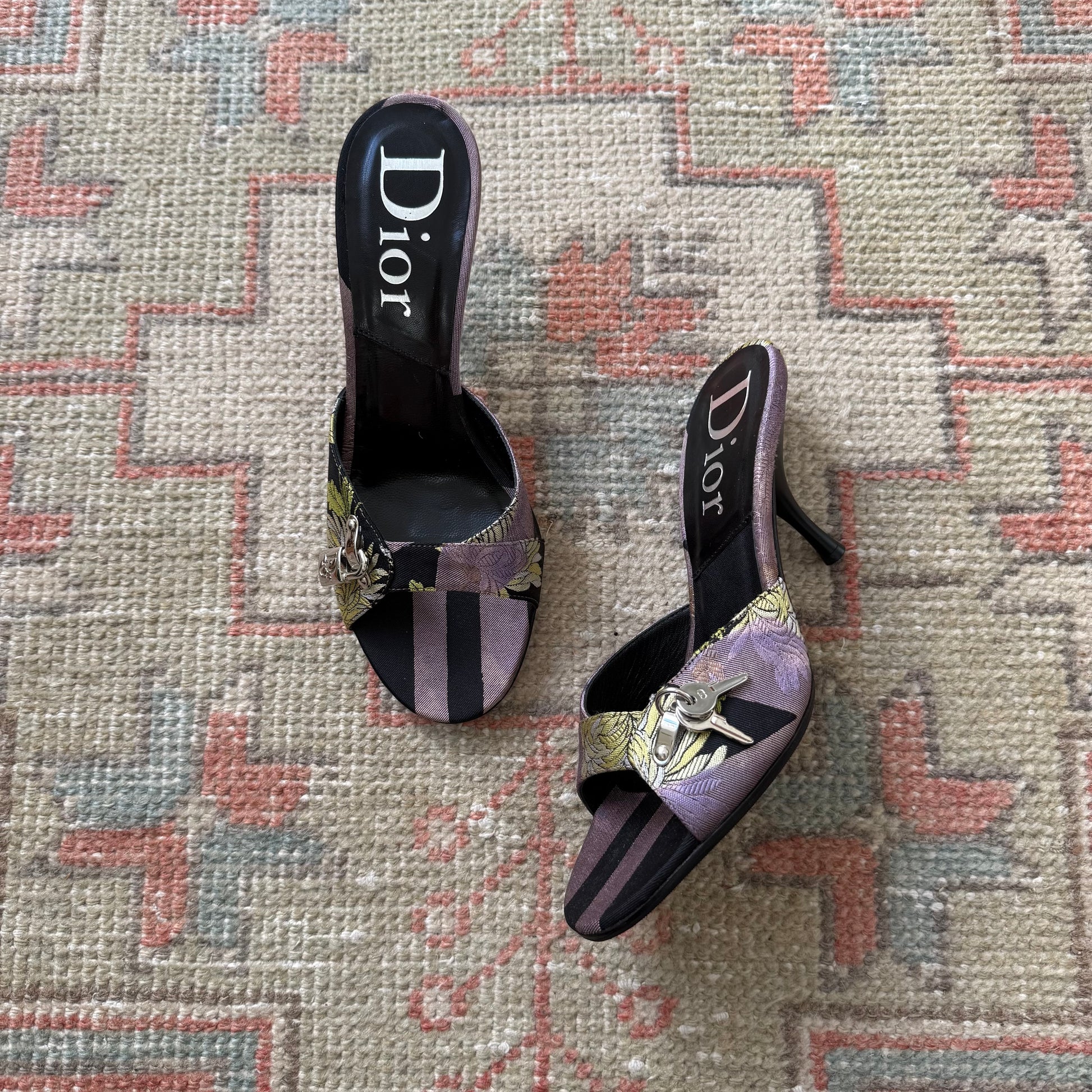 S/S2005 John Galliano Christian Dior silk jacquard chrysanthemum lock & key mules. Labeled size 36.5, run large and fit US 7 best. Purple, chartreuse and black print with nickel logo and key hardware. 3.5” heel. Will eventually need new heel caps, but still in perfectly good condition. These have been resoled. Excellent vintage condition, comes with original dustbag.