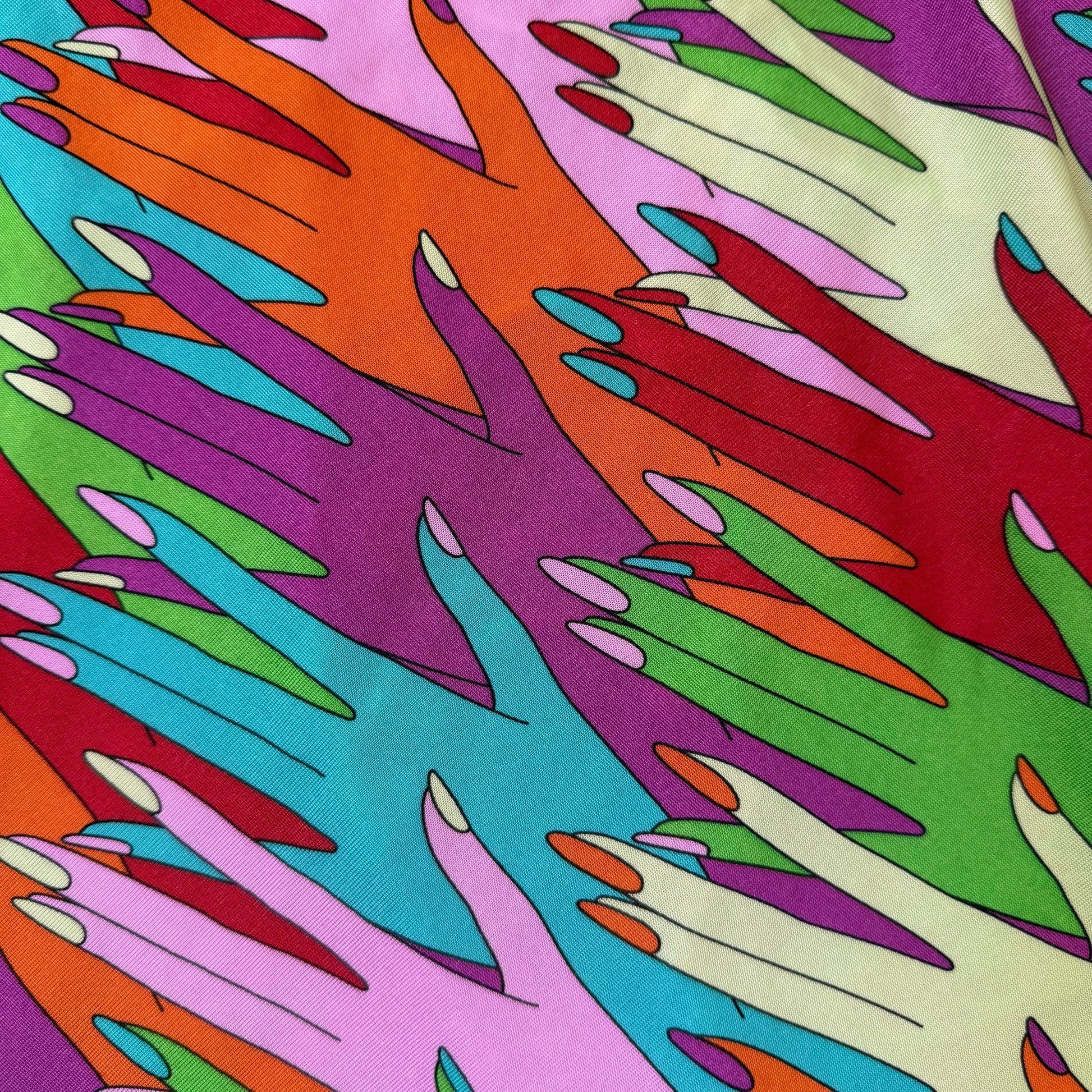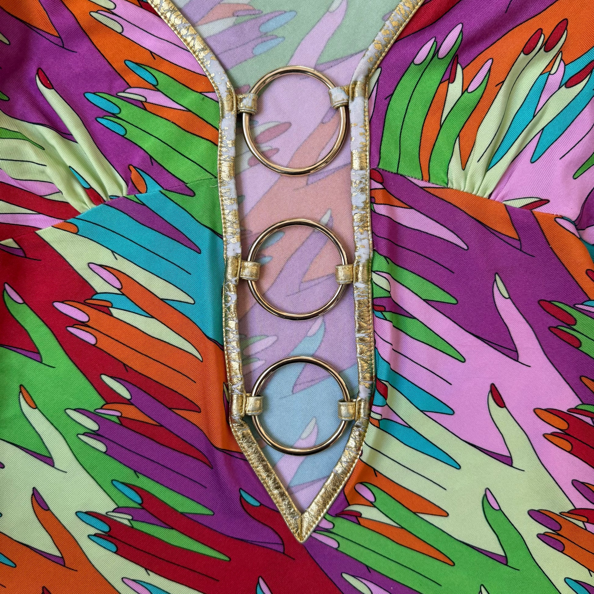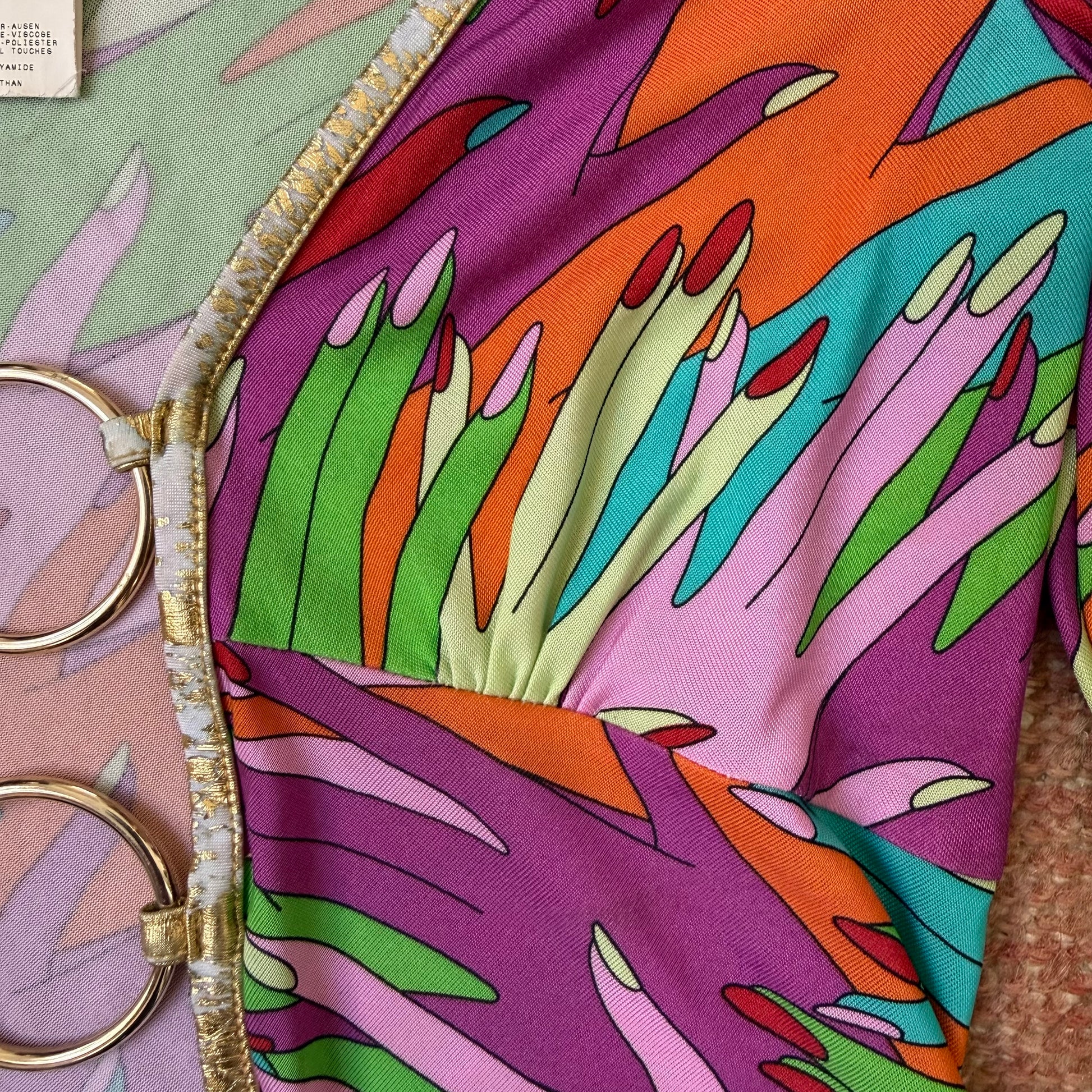 Ultra rare D&G by Dolce & Gabbana multicolor hands print top with gold o-ring hardware. Labeled size 26/40 fits US S best. 3/4 sleeve. Fabric has minimal stretch. Pink, blue and orange multicolored overlapping hands print throughout. Gold leather trim slightly peeling in areas, not visible when worn. Model is size small/34C bust. Excellent condition.