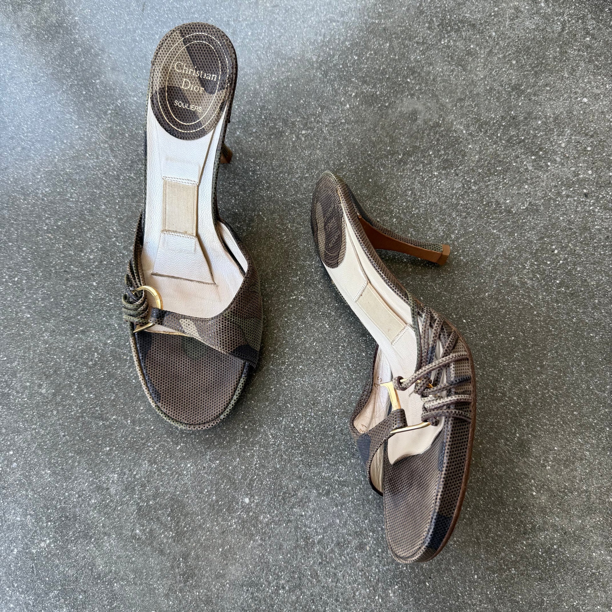 SS01 John Galliano Christian Dior Souliers camo logo mules. Labeled size 35.5, fits US 5-5.5 best. Camo print with gold “D” hardware at toes and strappy detailing. 3.75” heel. Light lifting of leather insole at toe box, otherwise excellent vintage condition with no major flaws.
