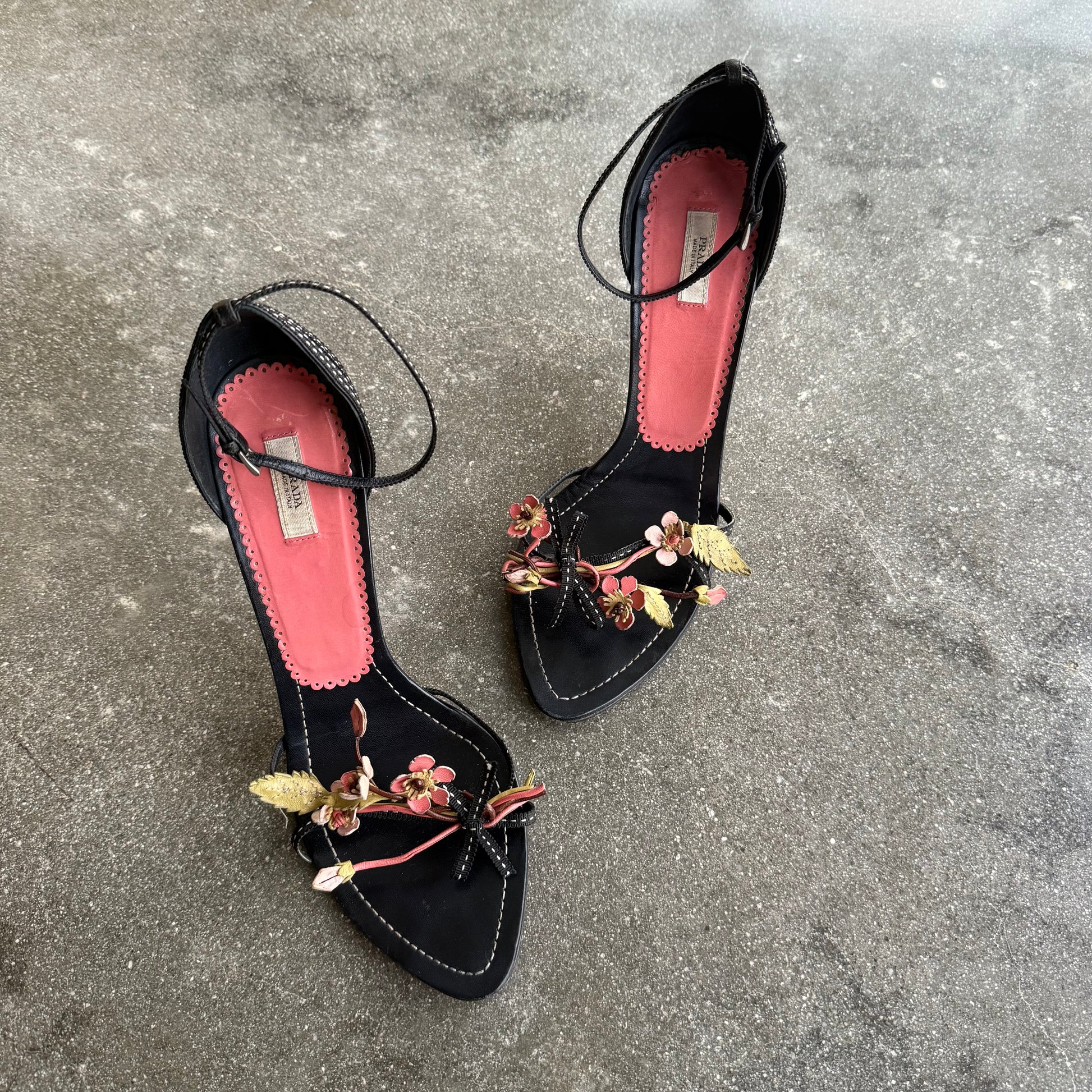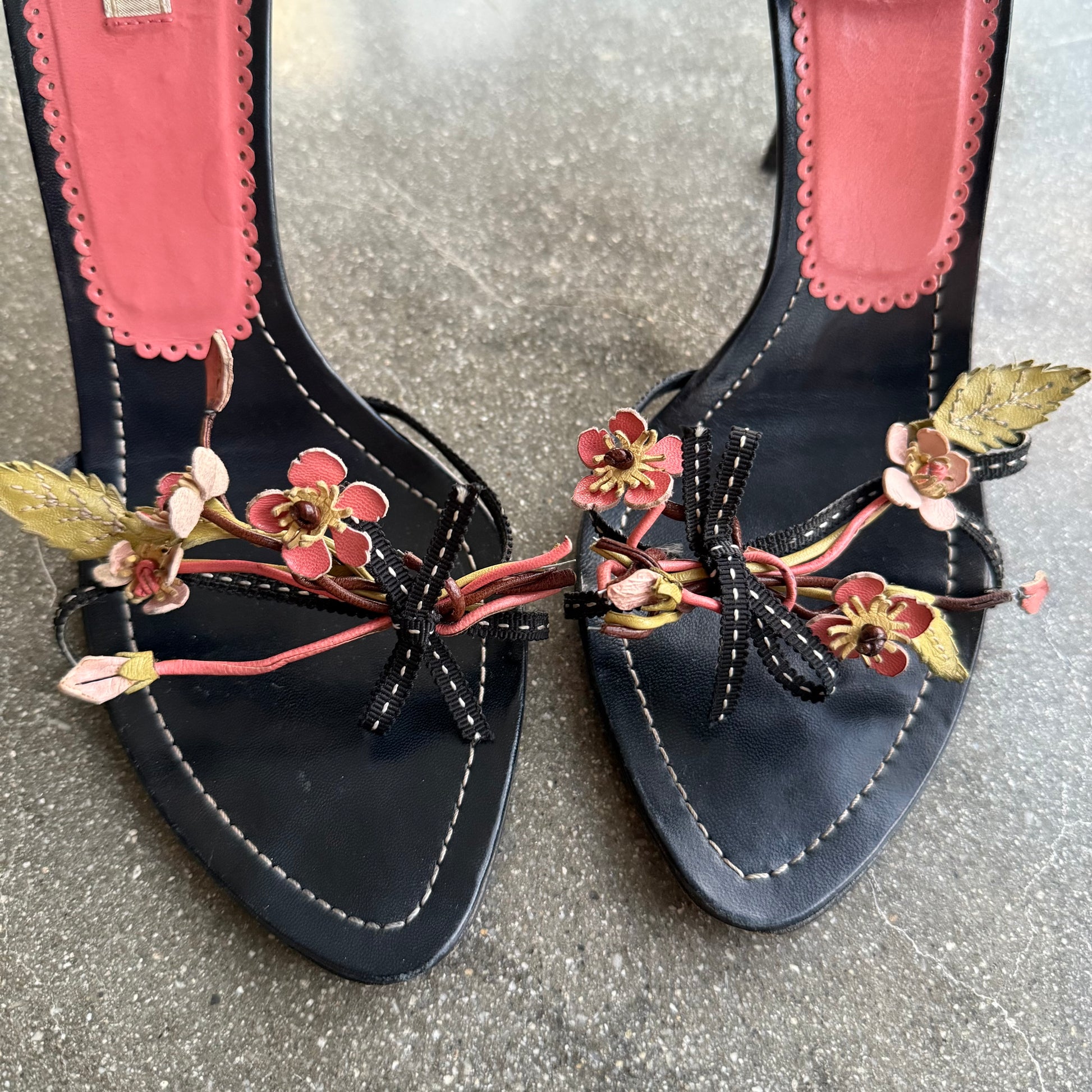 Super rare SS03 black and pink Prada bouquet sandals. Size 40, fits US 9.5-10 best. 4.5” heel. Grosgrain adjustable ankle strap with matching bows. Flowers are adjustable with bendable wire wrapped in leather. New heel tips, very good condition. No major flaws to note.