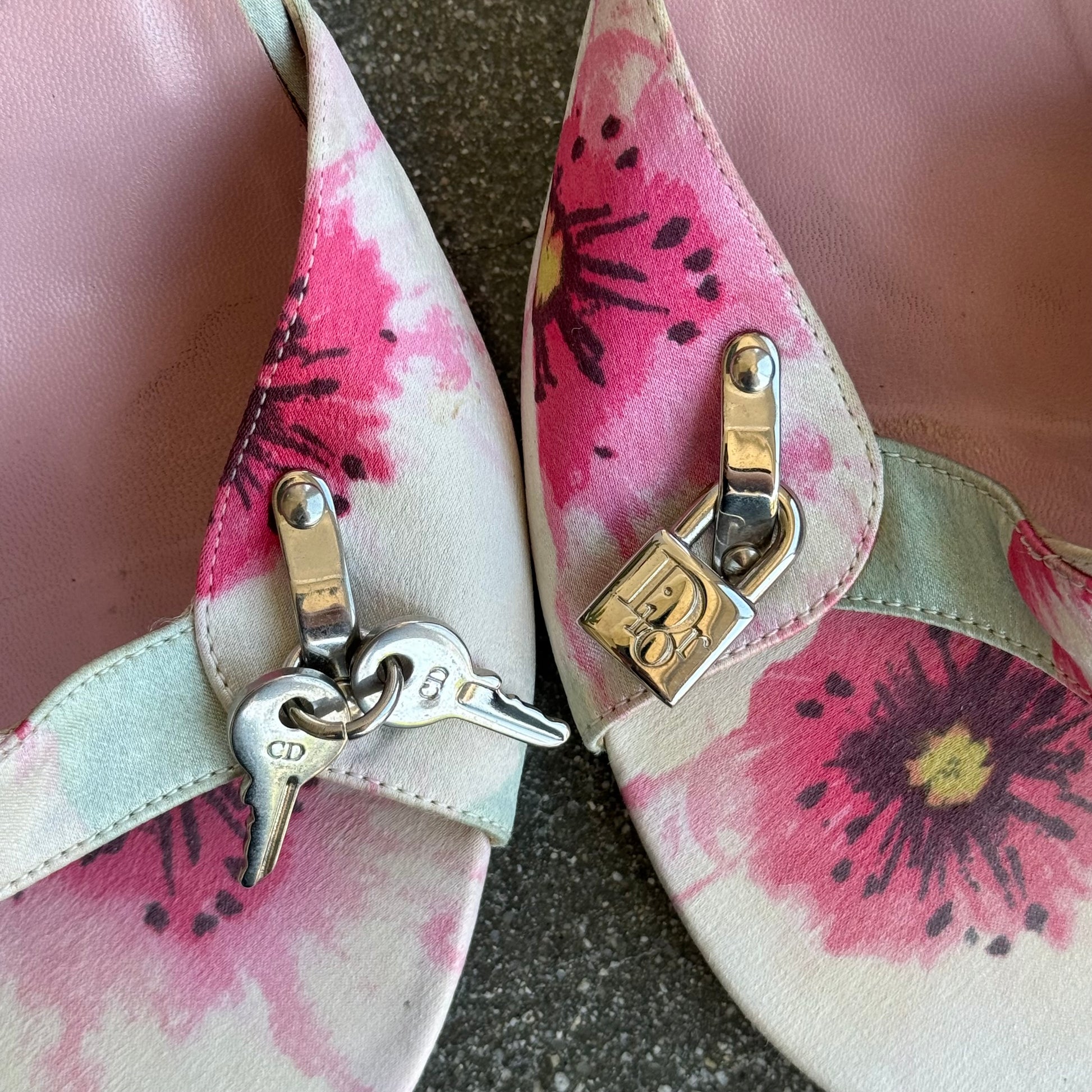 SS05 John Galliano Christian Dior floral satin lock and key mules. Size 38, run 1/2 size small and fit US 7.5 best. Pink, blue and white print with blue heels. 3.75” heel height. Light wear throughout. Light scratch at heels, not noticeable when worn. Overall very good vintage condition. New soles.