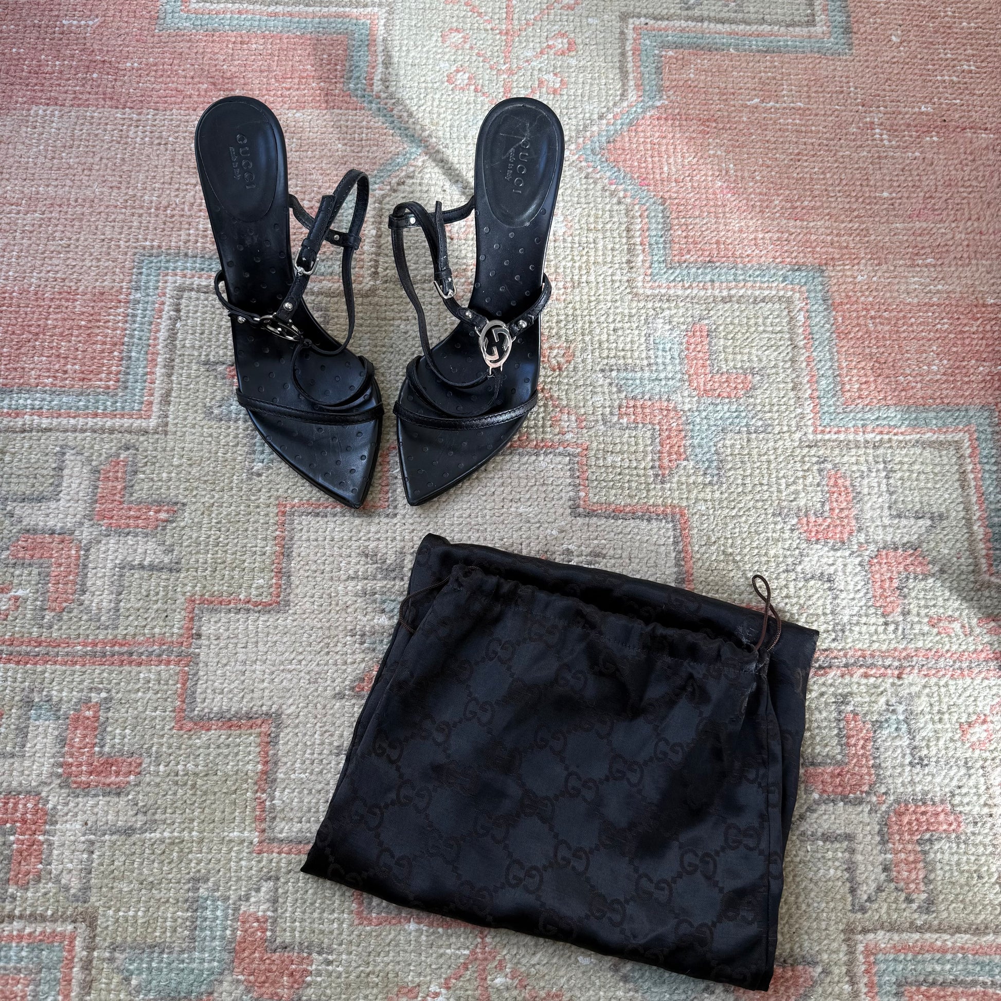 F/W2002 Gucci by Tom Ford black perforated leather strappy sandals. Labeled 37.5, fits US 7.5 best. Nickel double G logo. Crossover adjustable ankle straps. Pointed toe. 4” heel. New heel tips. Excellent condition. No notable flaws. Comes with original dustbag.