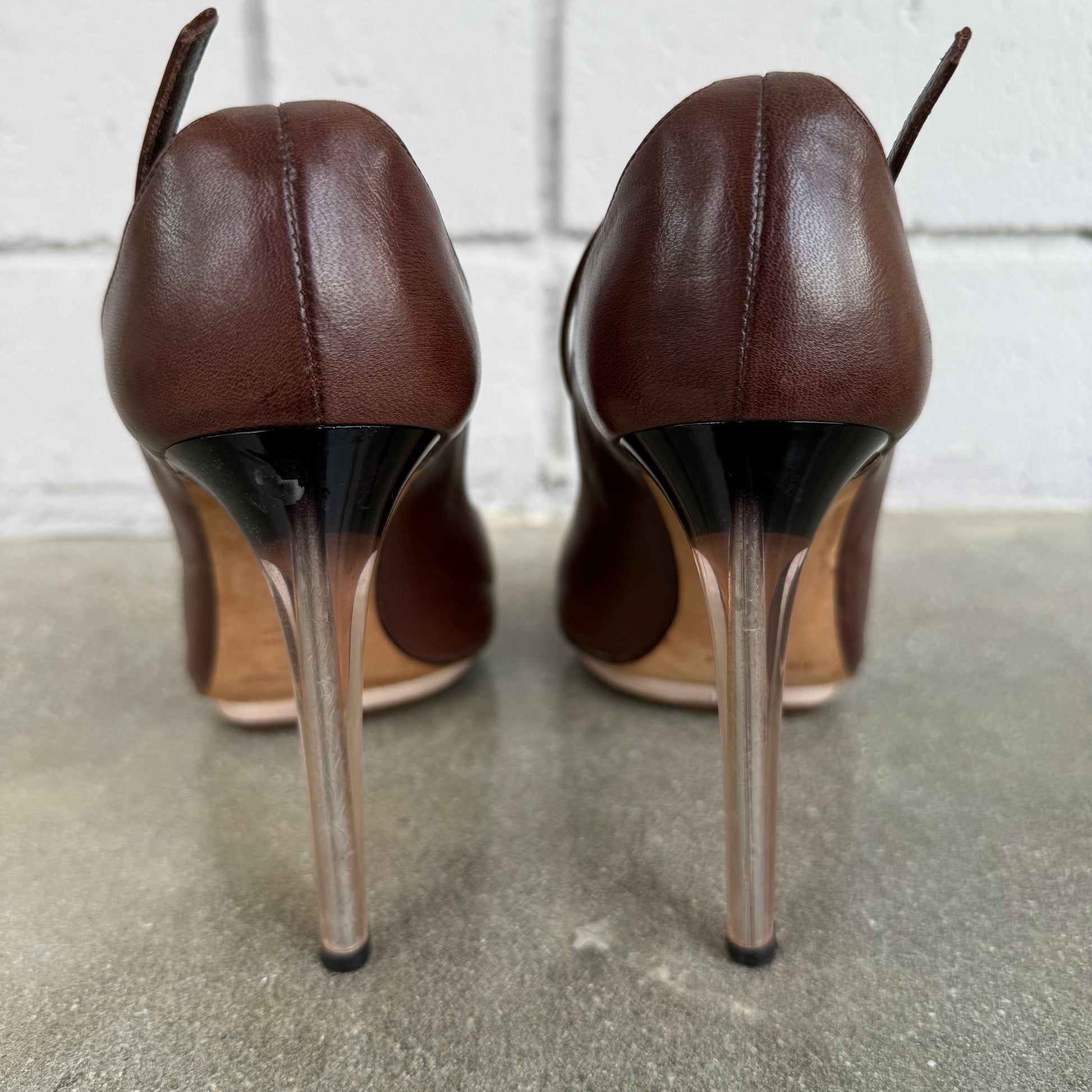 Tom Ford Yves Saint Laurent SS03 Dali Lip Peep Toe heels. Labeled size 37.5, fits US size 7.5 best. Brown leather with ombré lucite heels. Adjustable ankle straps. 4” heel. Platform soles have been re-soles. Excellent vintage condition, no major flaws to note. Comes with original dustbag.